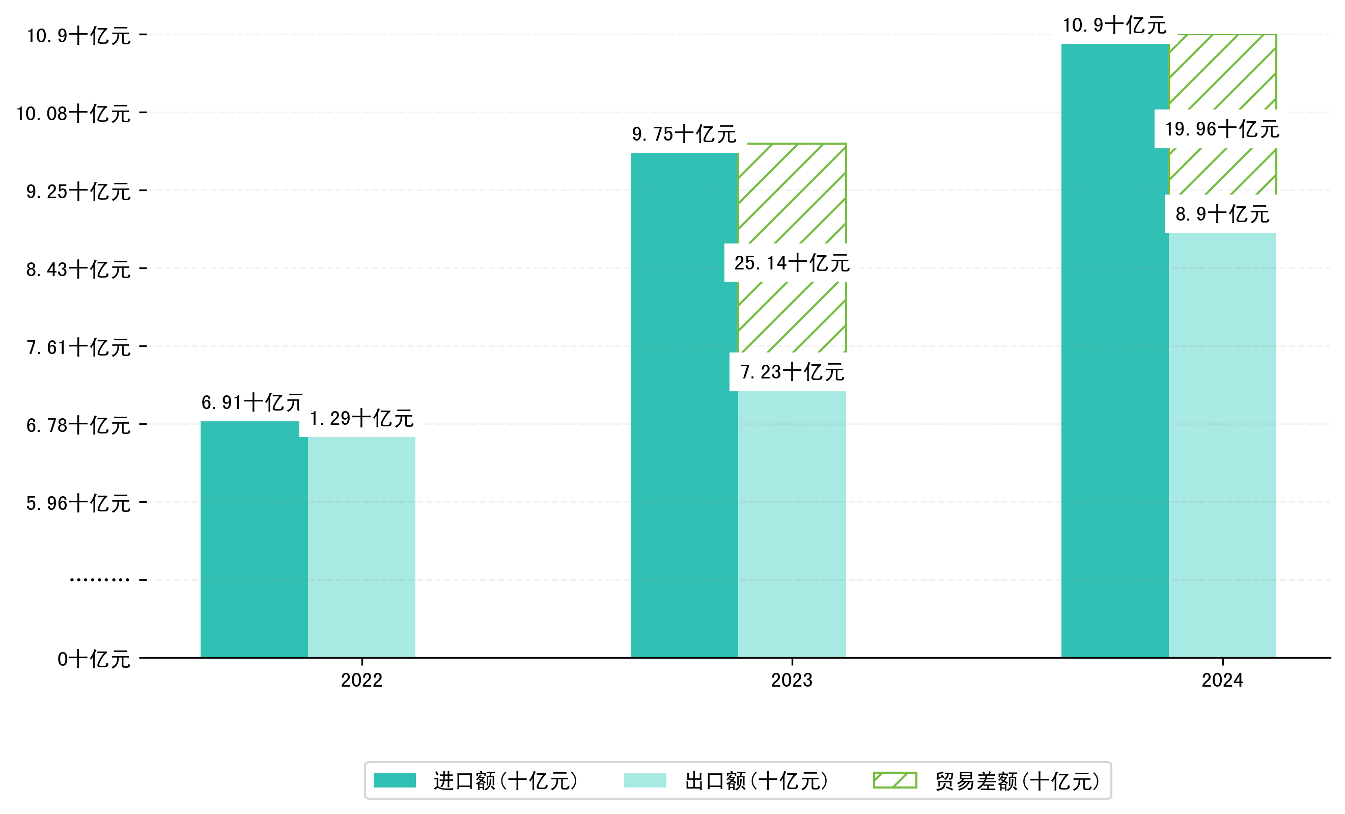 以人民币计,2024年1-7月包头市贸易差额为19,9615,6231万元(贸易逆差),相比上年同期增加了5,1749,2283万元,同比增加-20.59%。