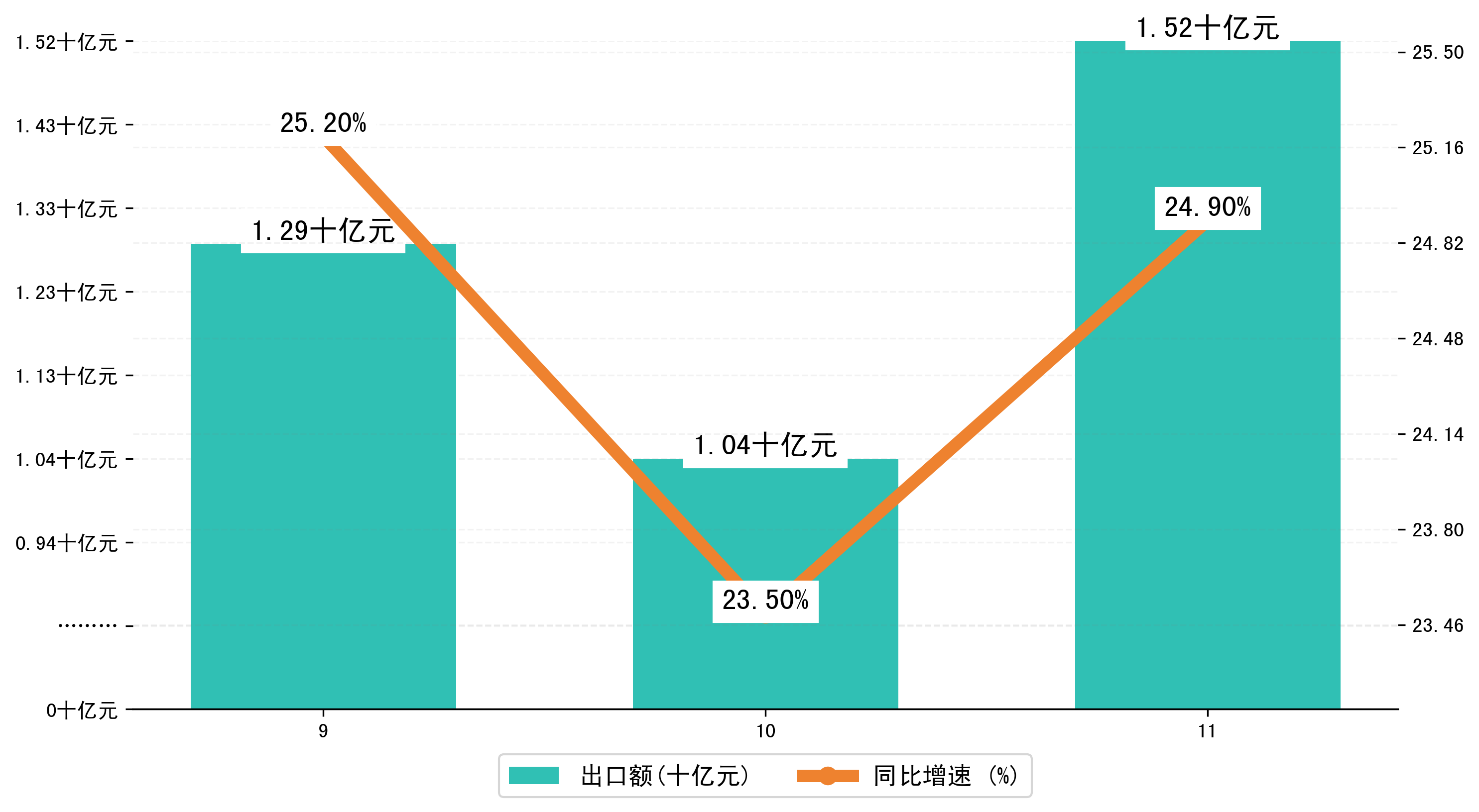以人民币计,2024年1-11月包头市出口额为141,0078.9622万元,相比上年同期增加了28,1126.7195万元,同比增加了24.90%。