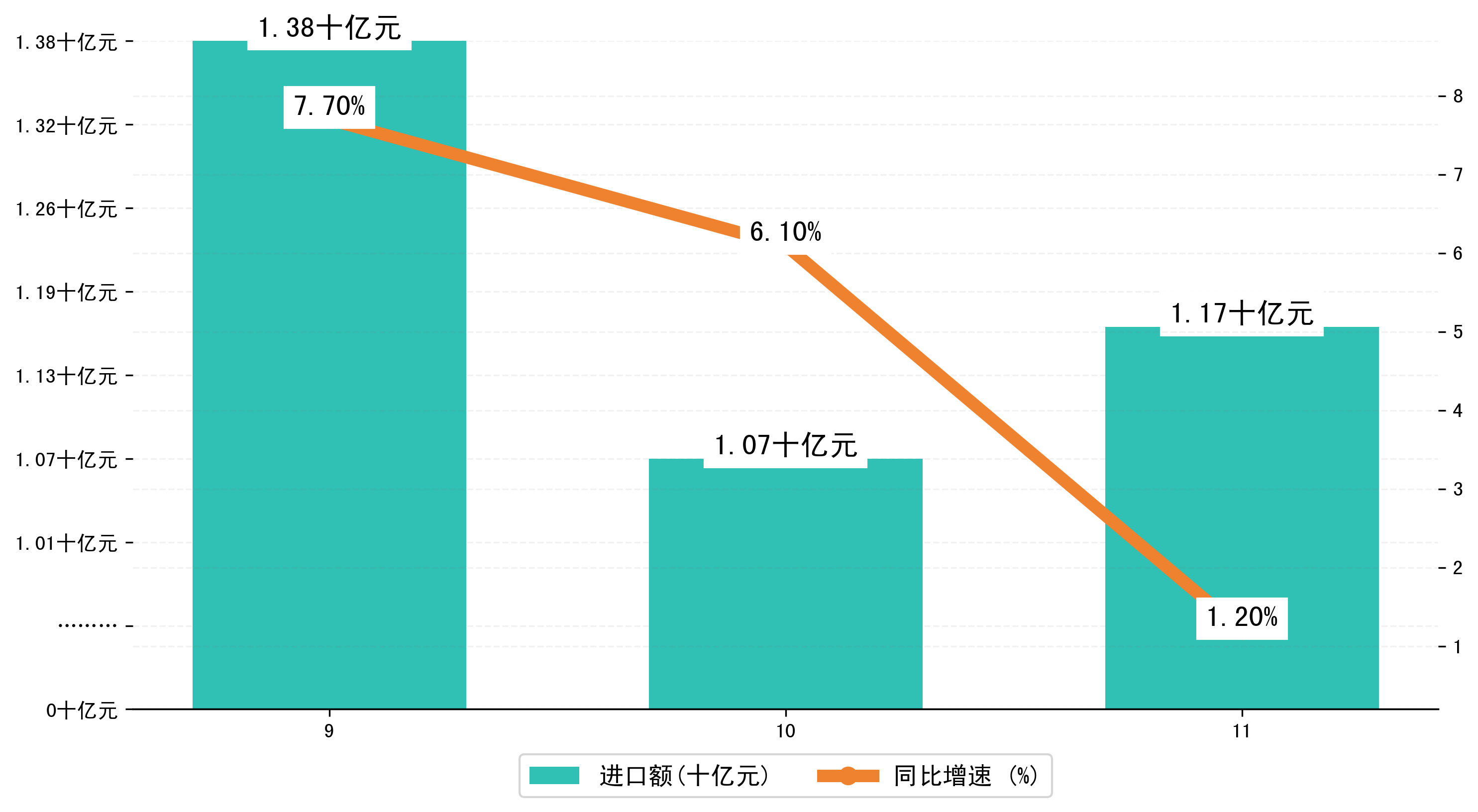 以人民币计,2024年11月包头市进口额为11,6864.2113万元,相比上月增加了9695.4702万元;相比上年同期减少了6,5289.8466万元,同比增加了1.20%。