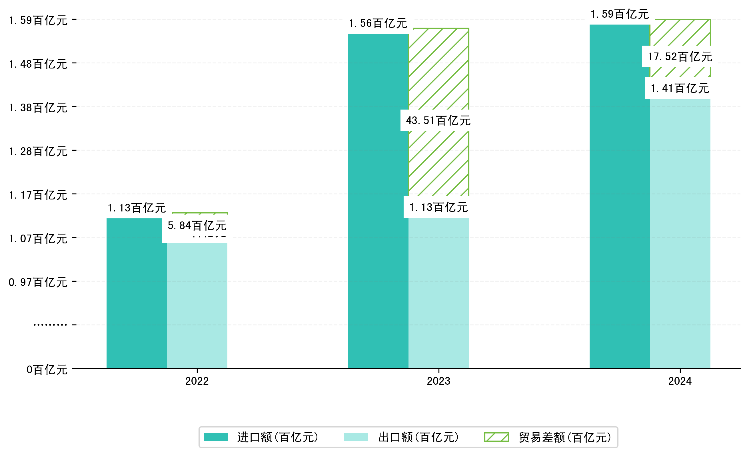 以人民币计,2024年1-11月包头市贸易差额为17,5167,2009万元(贸易逆差),相比上年同期增加了25,9893,2874万元,同比增加-59.74%。