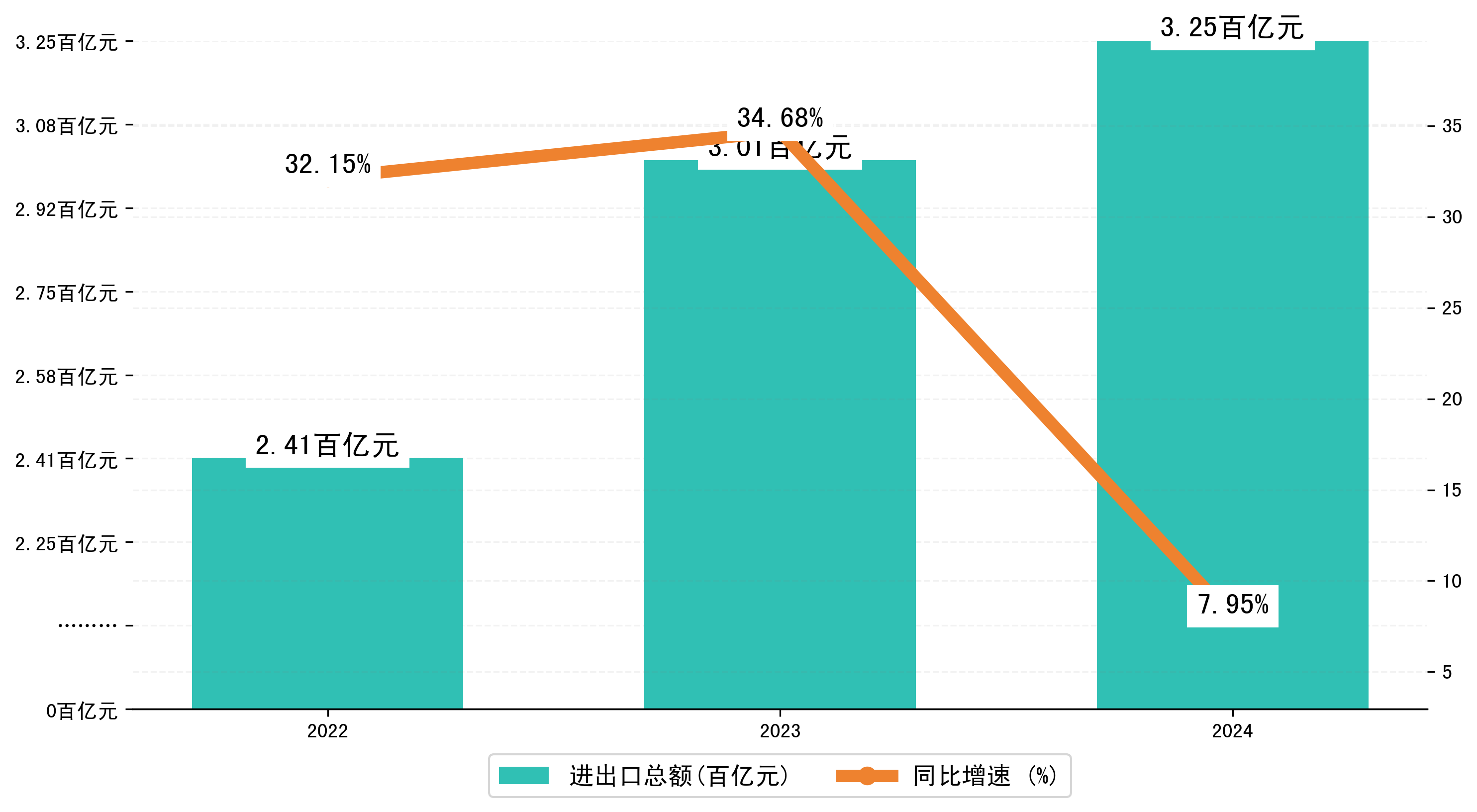 以人民币计,2024年1-12月包头市进出口总额为325,2435.594万元,相比上年同期增加了23,9471.2366万元,同比增加了8.40%。