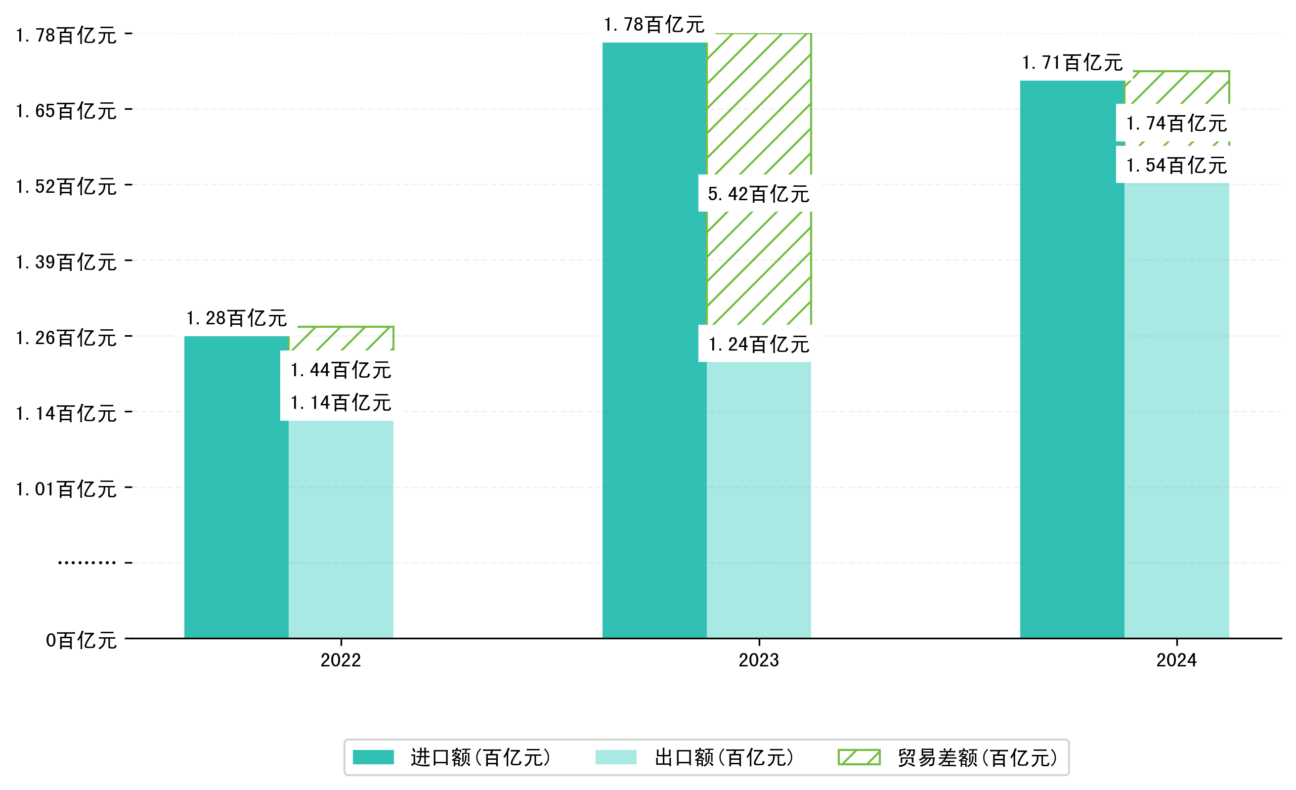 以人民币计,2024年1-12月包头市贸易差额为17,4000,6858万元(贸易逆差),相比上年同期增加了36,8390,4606万元,同比增加-67.92%。
