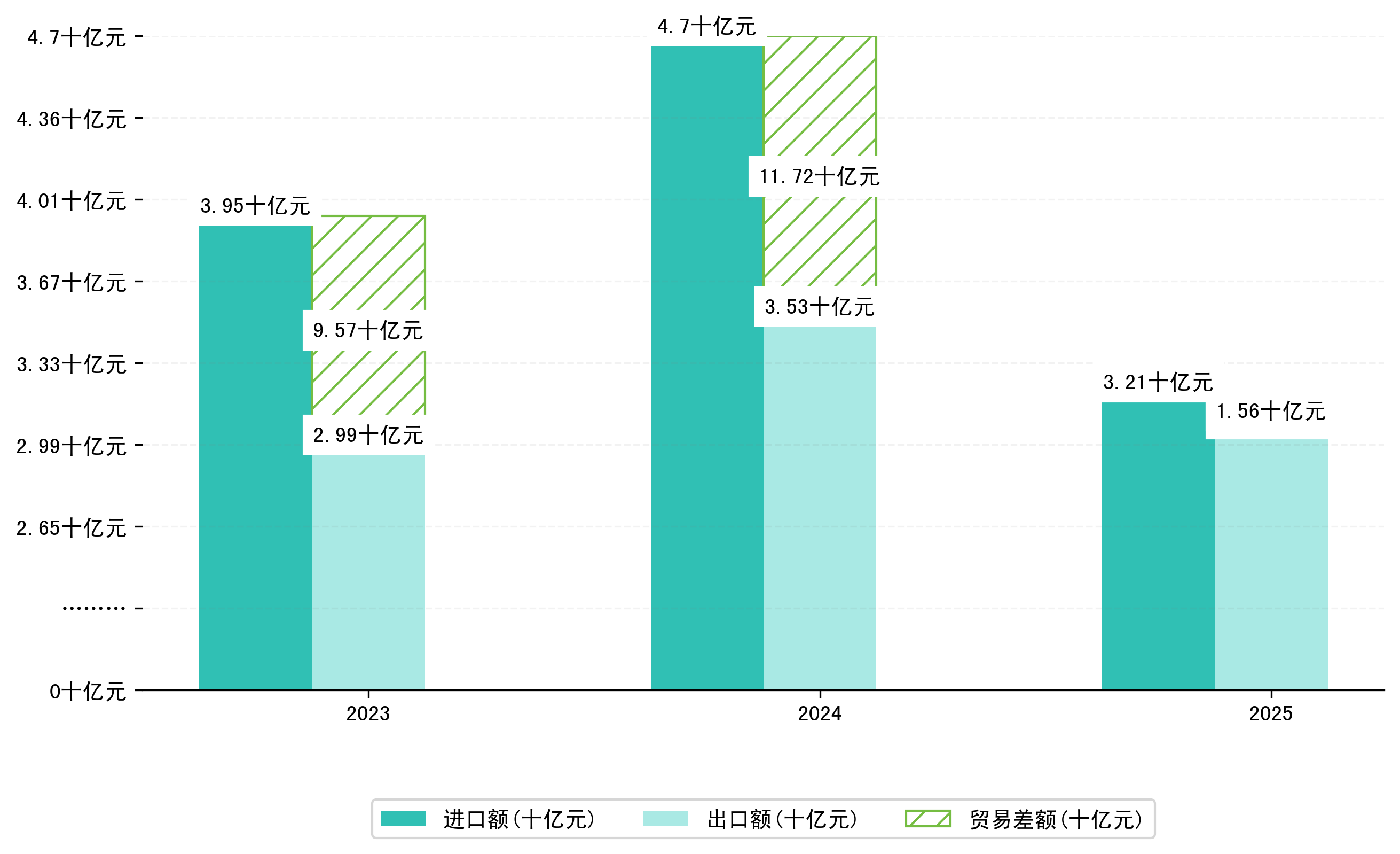 以人民币计,2025年1-3月包头市贸易差额为1,5560,7279万元(贸易逆差),相比上年同期增加了10,1648,3982万元,同比增加-86.72%。
