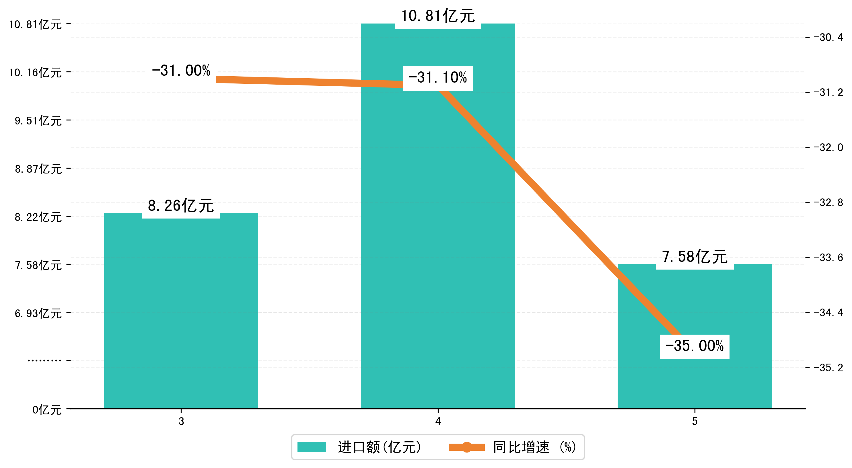 以人民币计,2025年5月包头市进口额为7,5776.9671万元,相比上月减少了3,2281.2351万元;相比上年同期减少了7,6954.6095万元,同比减少了-35.00%。