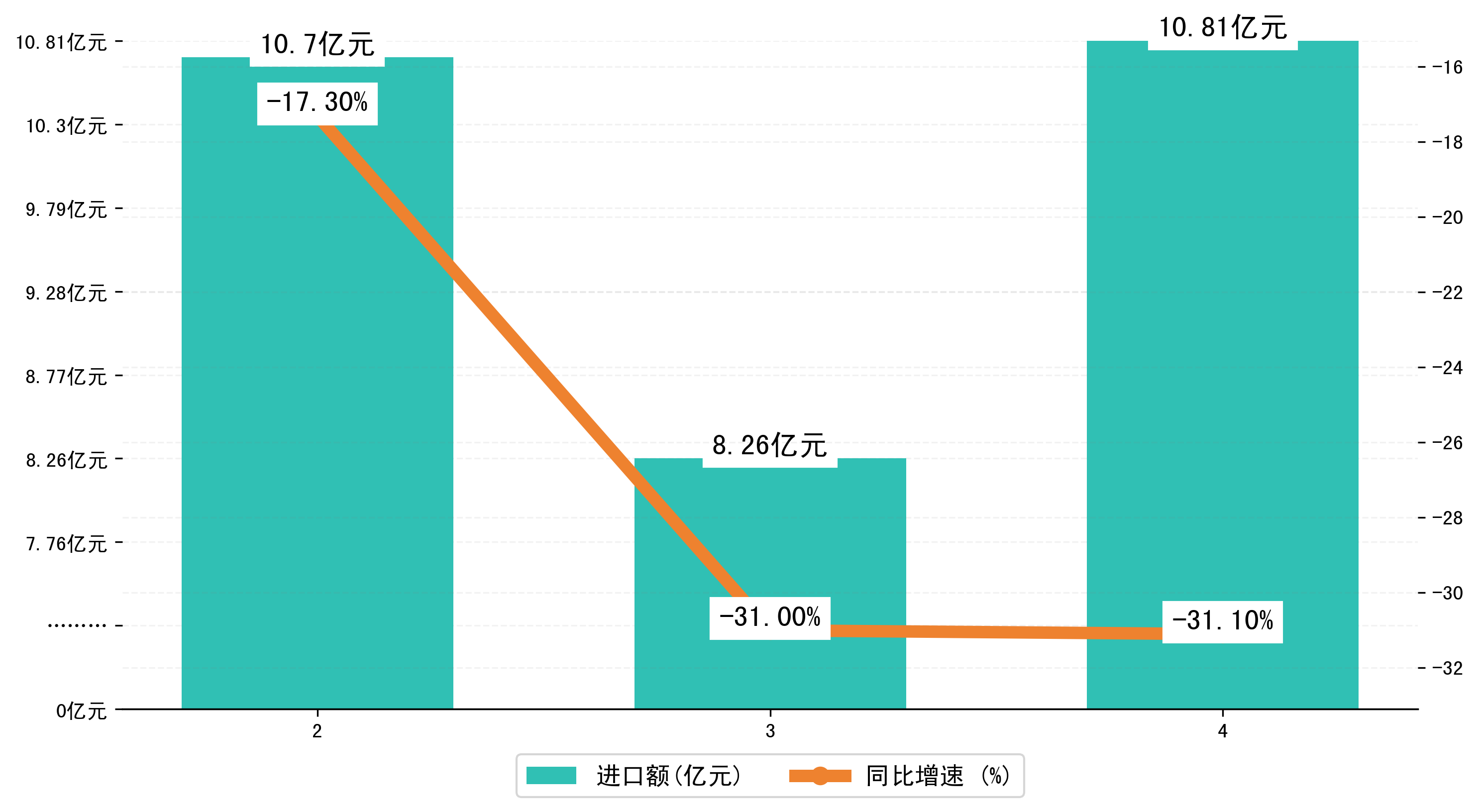 以人民币计,2025年1-4月包头市进口额为42,8221.5421万元,相比上年同期减少了20,4028.3628万元,同比减少了-31.10%。