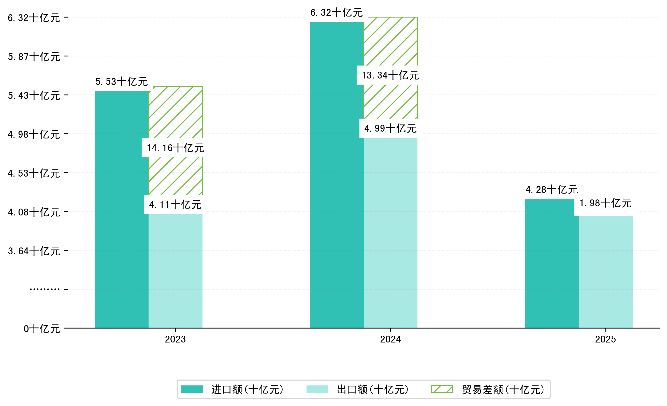 以人民币计,2025年1-4月包头市贸易差额为1,9754,3011万元(贸易逆差),相比上年同期增加了11,3640,5561万元,同比增加-85.19%。