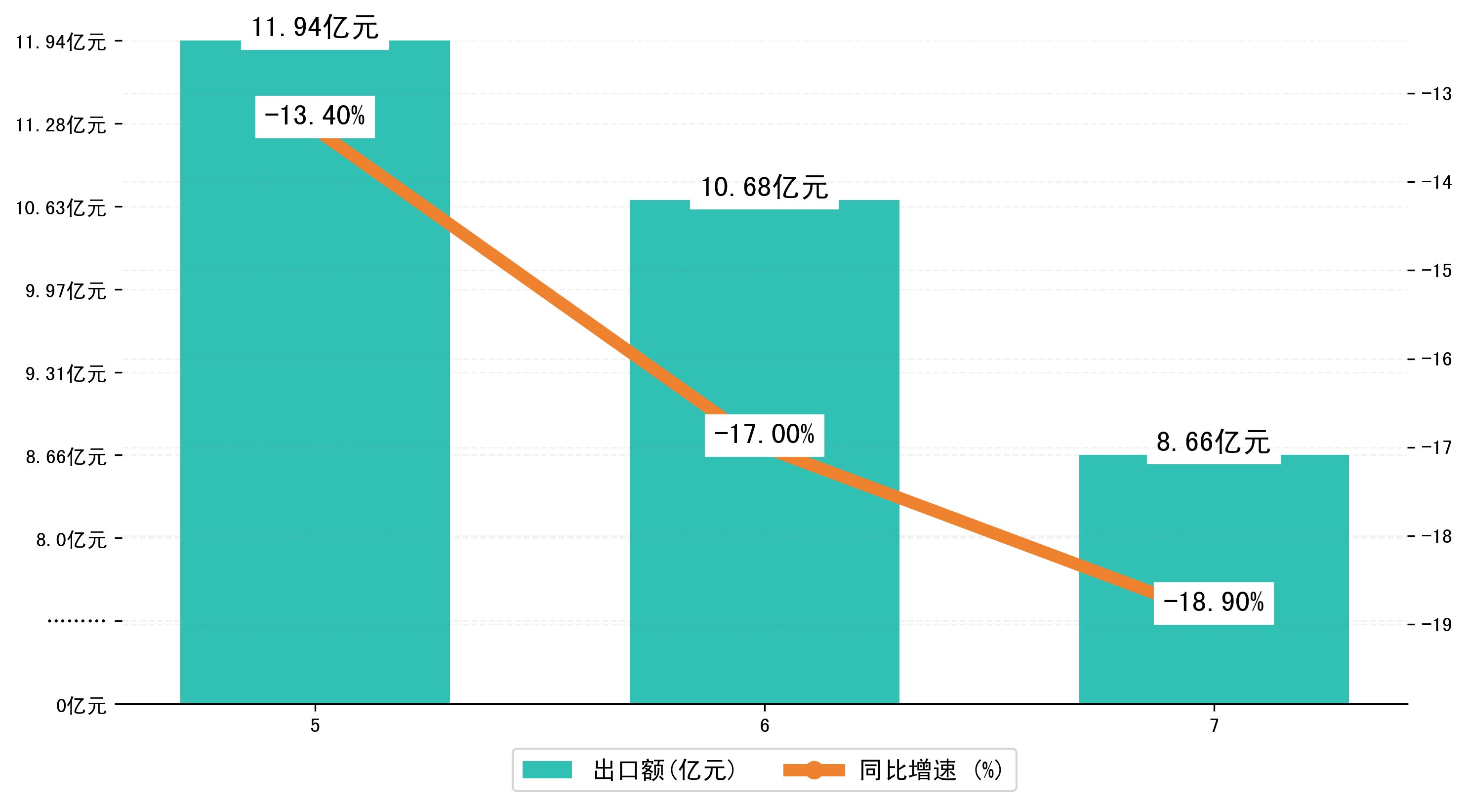 以人民币计,2025年7月包头市出口额为8,6583.4753万元,相比上月减少了2,0181.2979万元;相比上年同期减少了3,8415.6406万元,同比减少了-18.90%。