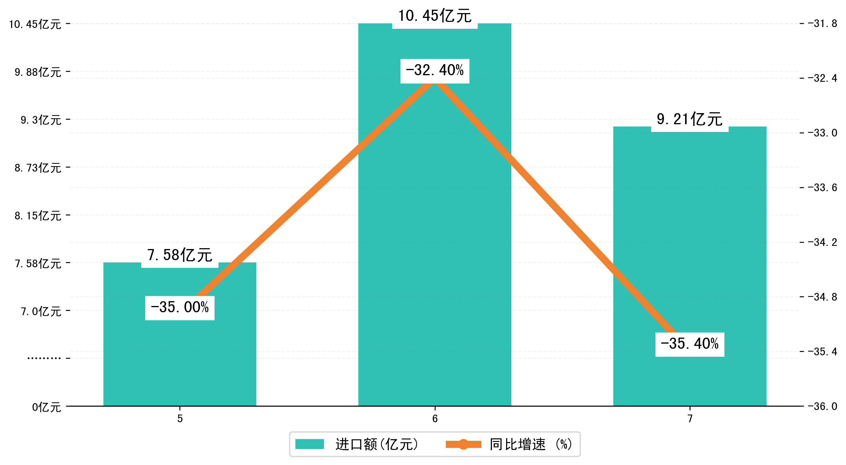 以美元计,2025年1-7月包头市进口额为9,7280.379万美元,相比上年同期减少了5,6135.7529万美元,同比减少-36.10%。