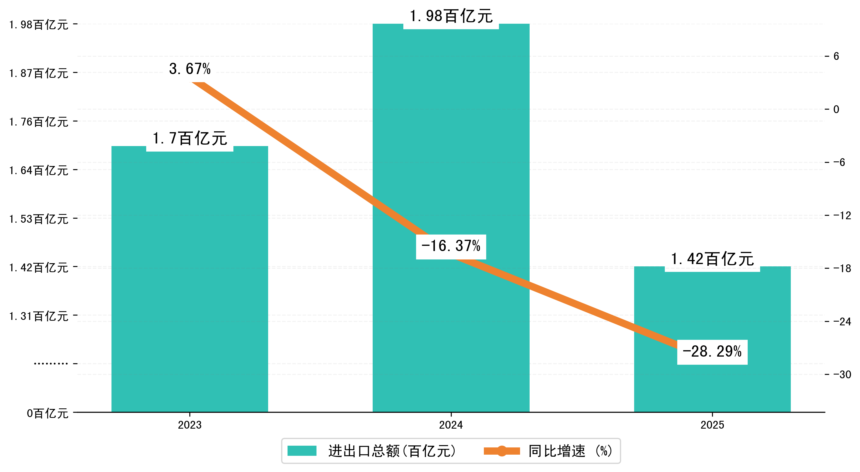 以美元计,2025年1-7月包头市进出口总额为19,7661.309万美元,相比上年同期减少了8,1036.2708万美元,同比减少-28.80%。