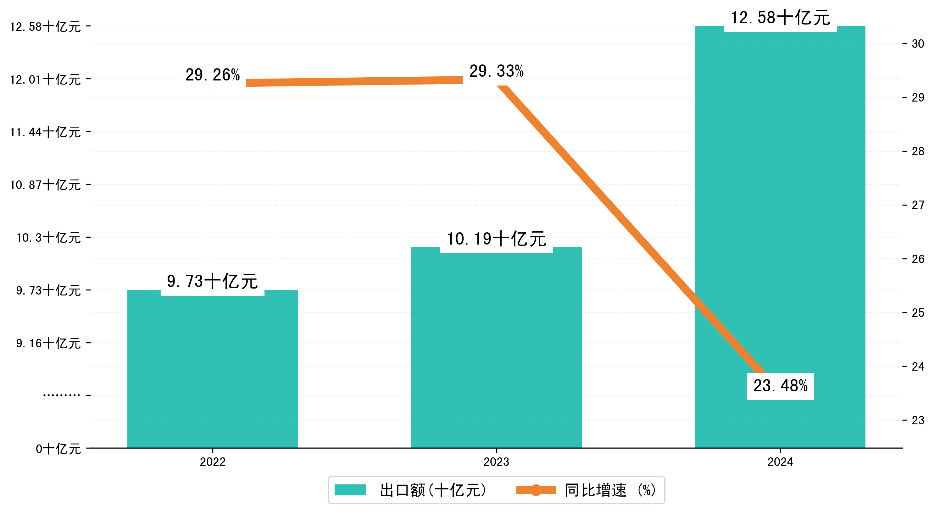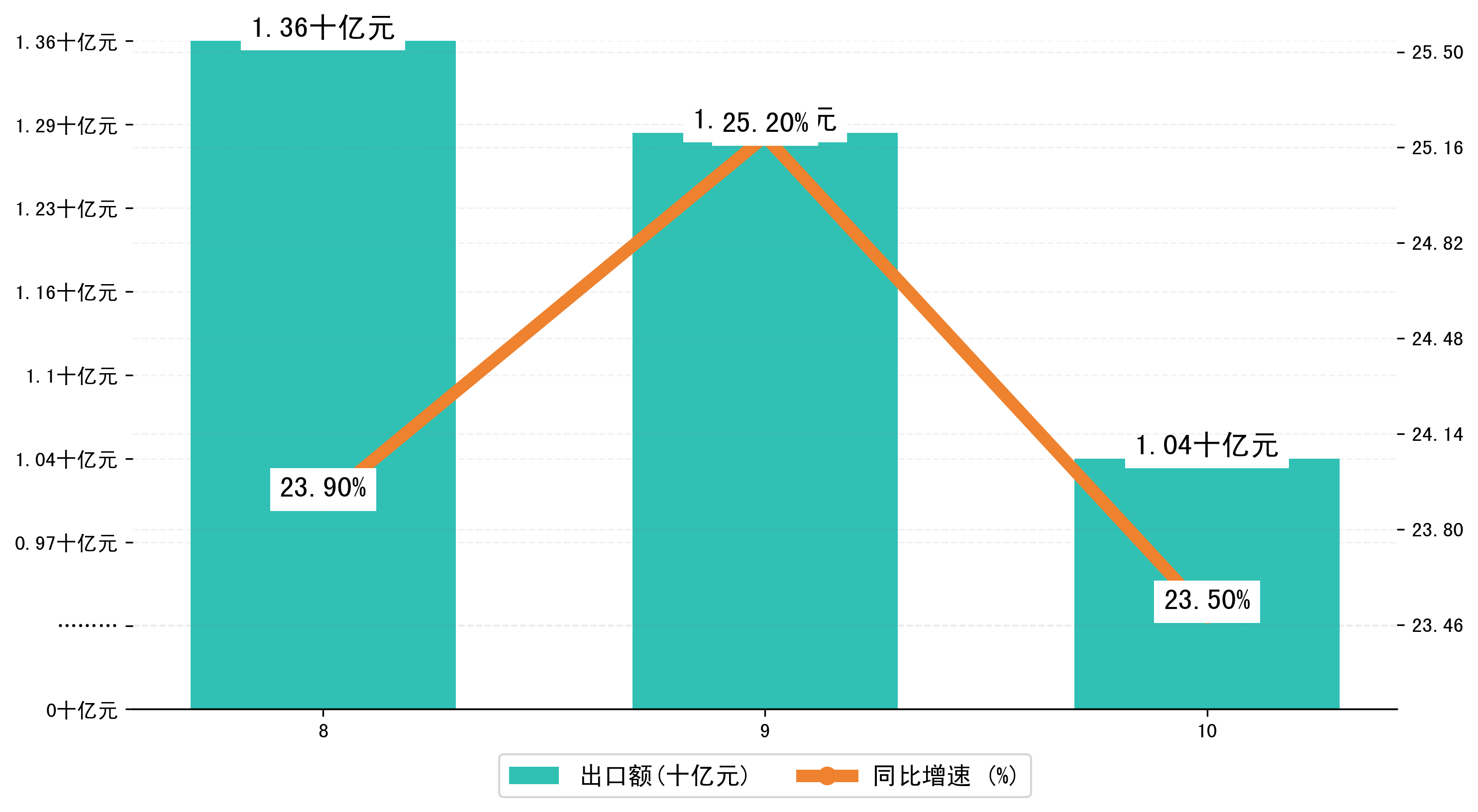 以人民币计,2024年1-10月包头市出口额为125,8268.9736万元,相比上年同期增加了23,9275.018万元,同比增加了23.50%。
