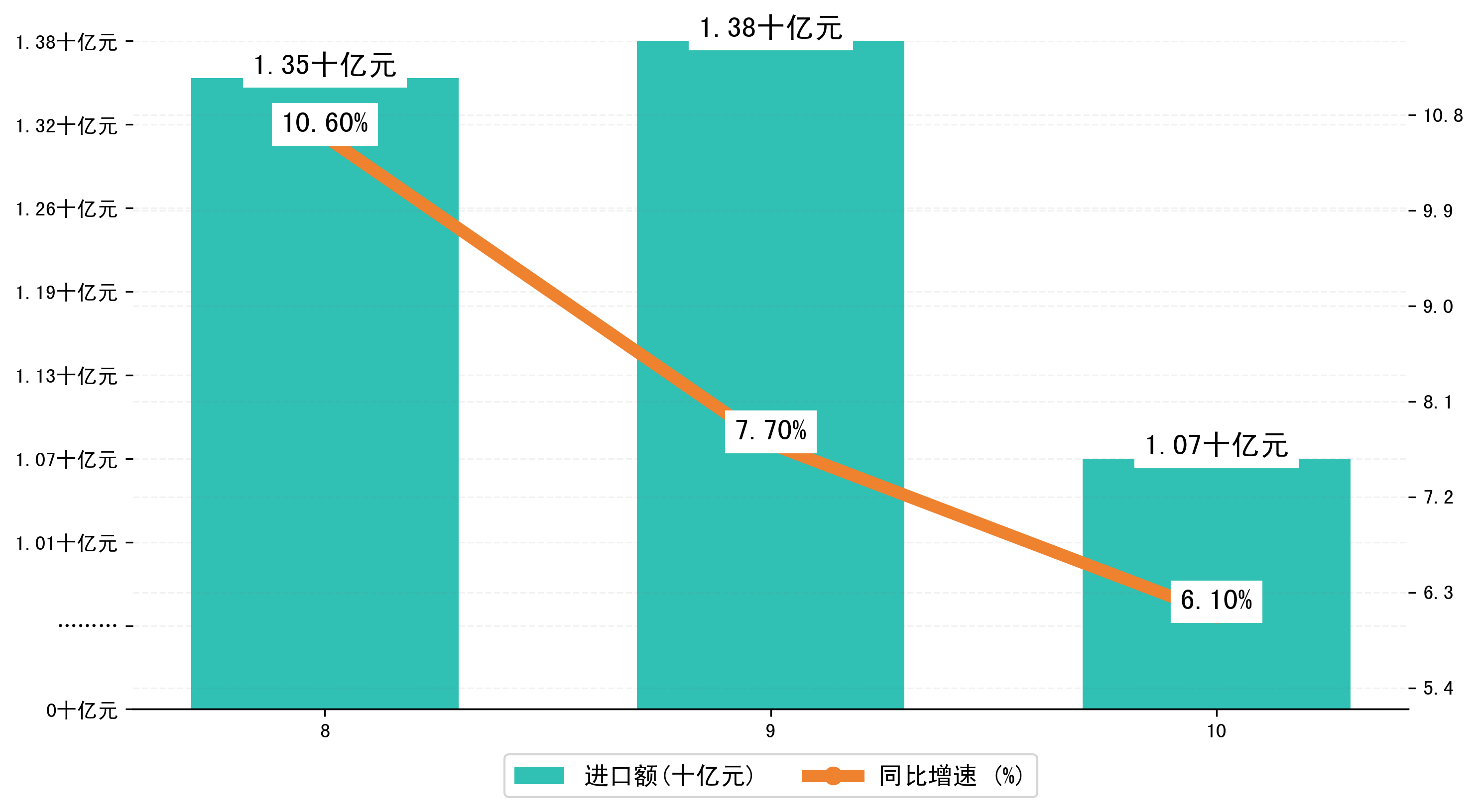 以人民币计,2024年1-10月包头市进口额为146,9371.0887万元,相比上年同期增加了8,7621.2184万元,同比增加了6.10%。