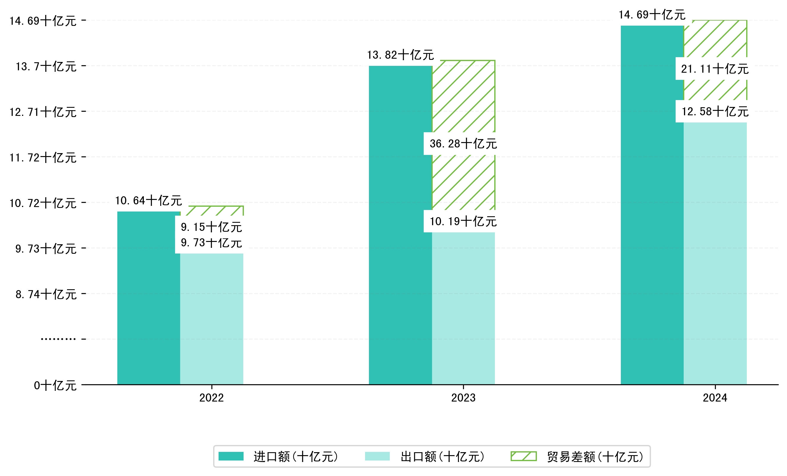 以人民币计,2024年1-10月包头市贸易差额为21,1102,1151万元(贸易逆差),相比上年同期增加了15,1653,7996万元,同比增加-41.81%。