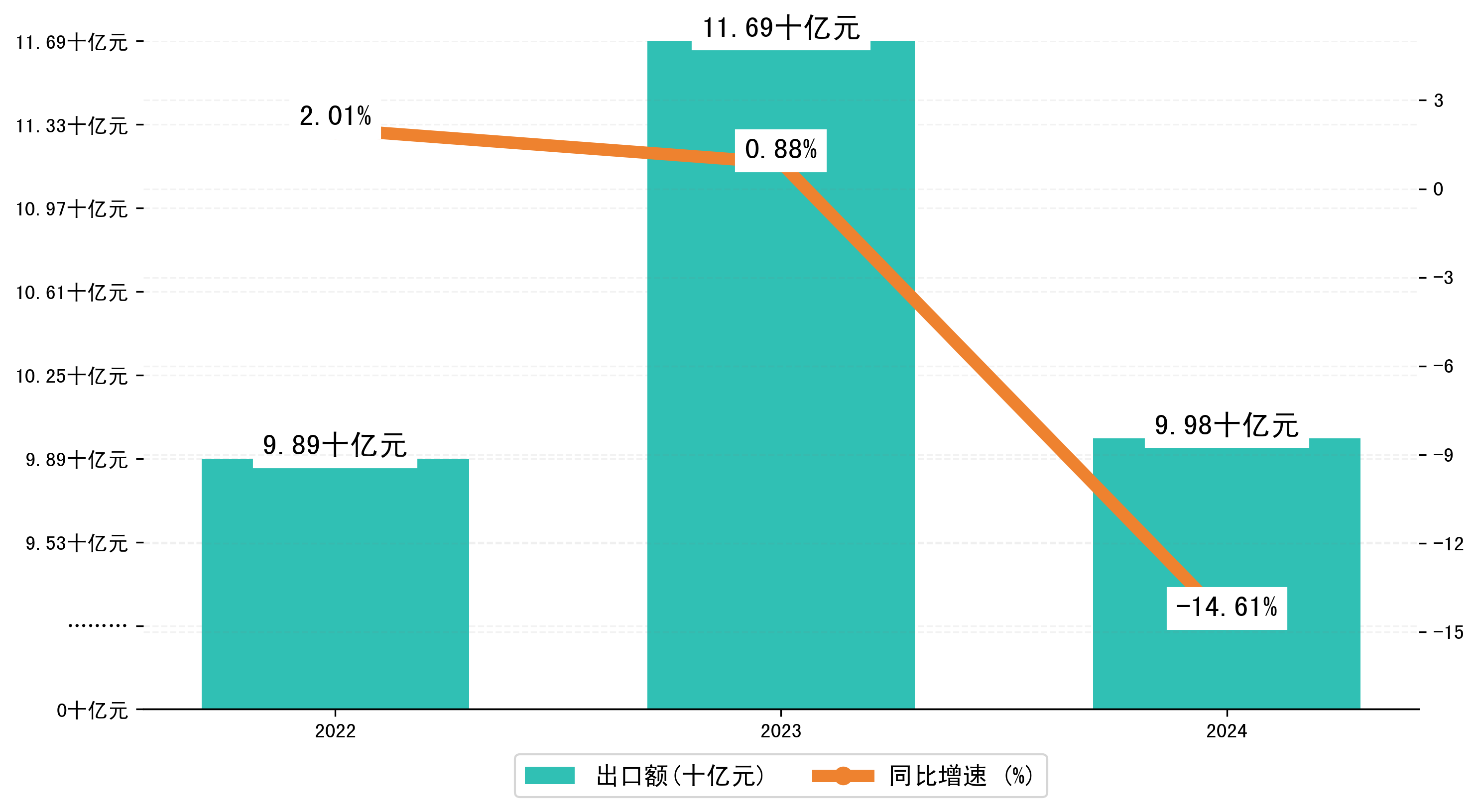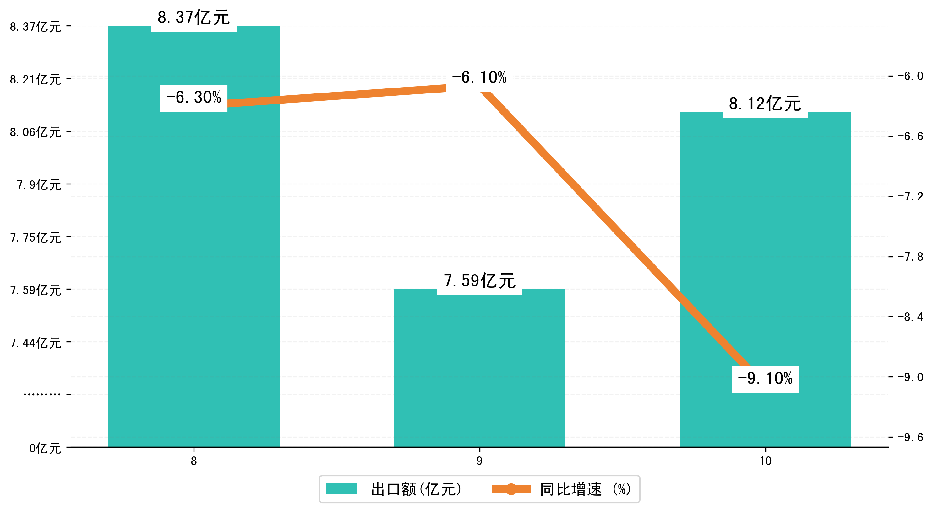 以人民币计,2024年1-10月北海市出口额为99,7983.7265万元,相比上年同期减少了17,0713.183万元,同比减少了-9.10%。