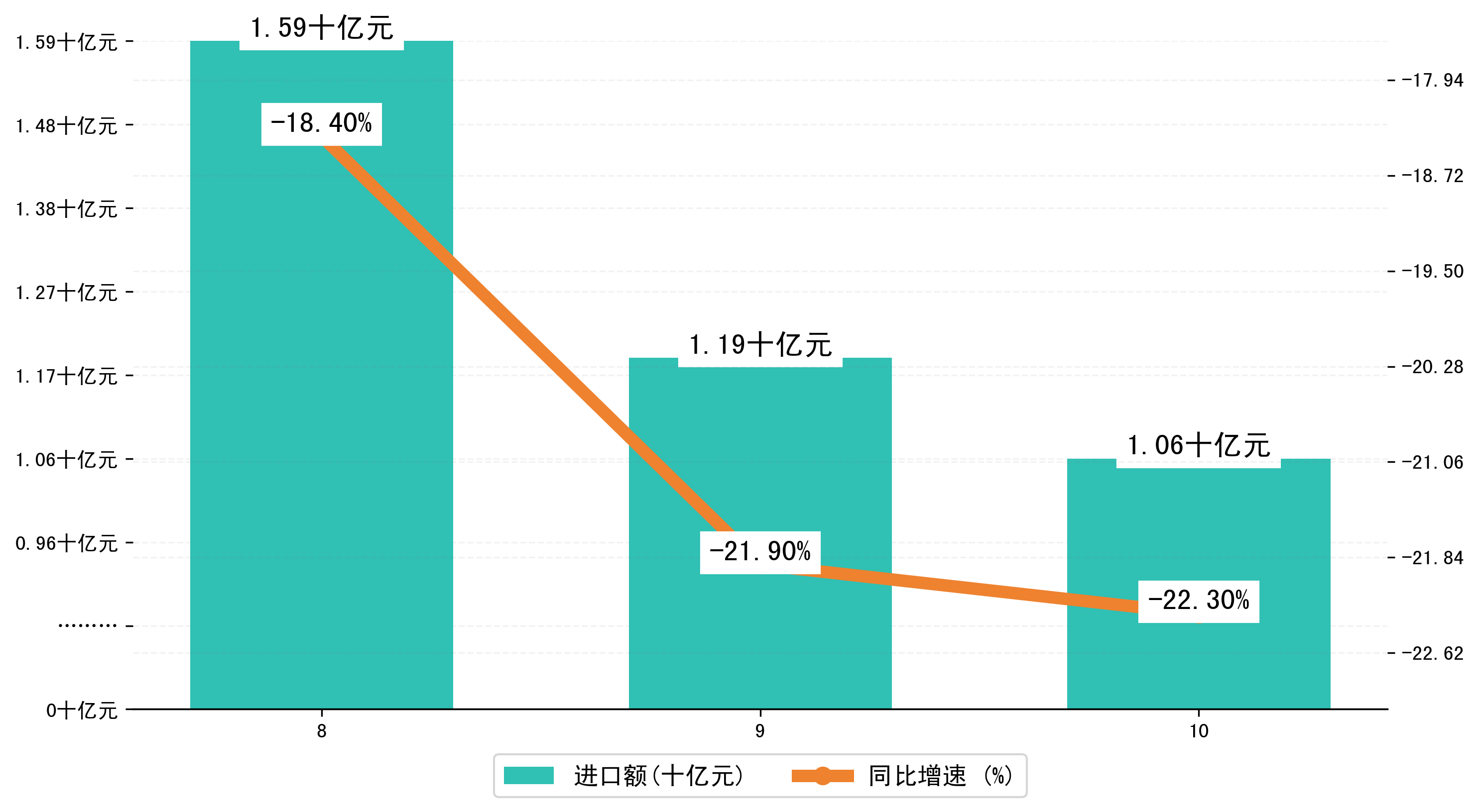 以美元计,2024年10月北海市进口额为1,4982.646万美元,相比上月减少了1695.9011万美元;相比上年同期减少了5174.6766万美元,同比减少-23.70%。