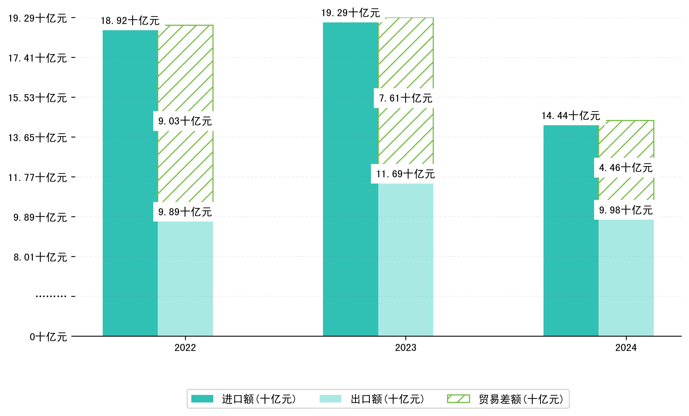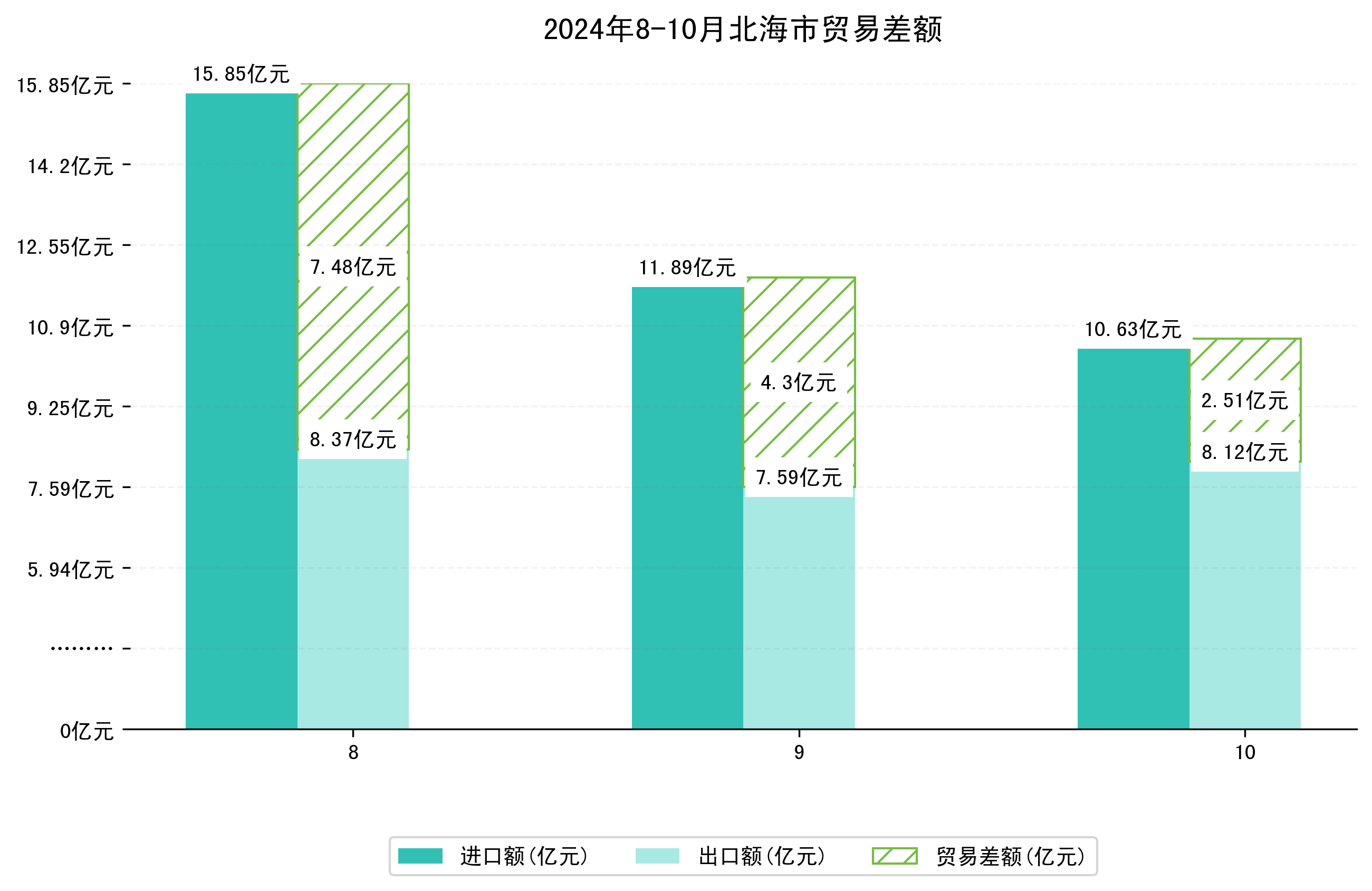 以人民币计,2024年10月北海市贸易差额为2,5138,8623万元(贸易逆差),相比上月增加了1,7834,7588万元,即2486,3738万美元;相比上年同期减少了5916,5710万元,同比减少30.78%。