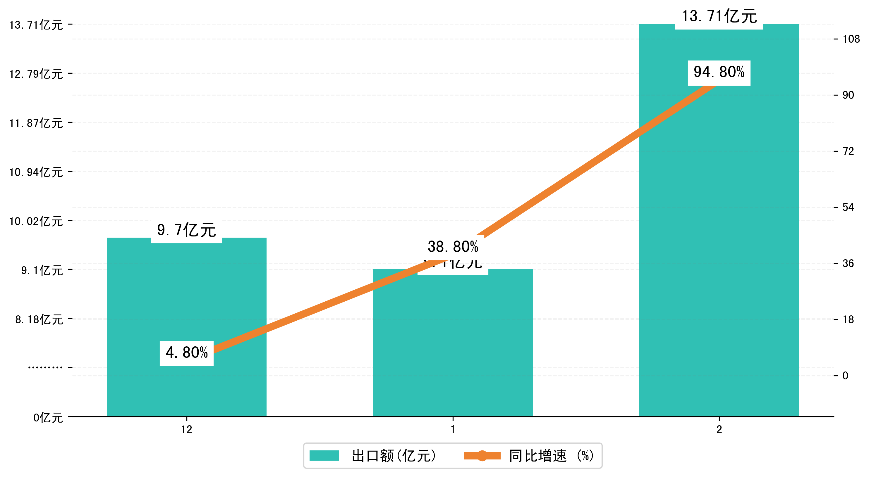 以人民币计,2023年2月北海市出口额为13,7078.3555万元,相比上月增加了4,6056.2799万元;相比上年同期增加了8,5572.3059万元,同比增加了94.80%。