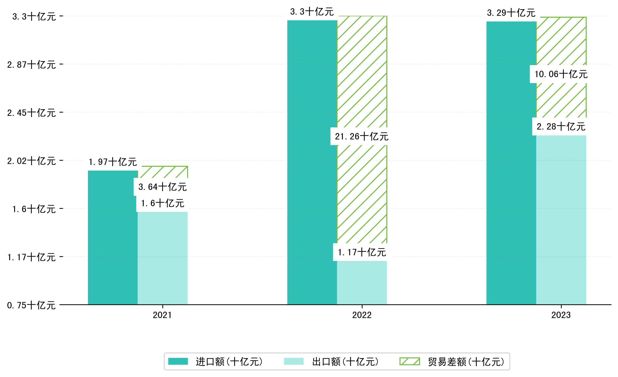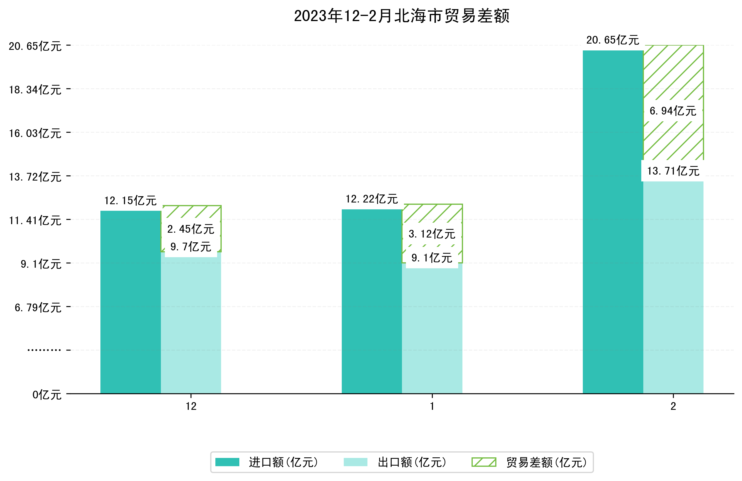 以人民币计,2023年2月北海市贸易差额为6,9378,0920万元(贸易逆差),相比上月减少了3,8175,9693万元,即5635,5343万美元;相比上年同期增加了3,0136,2648万元,同比增加-30.28%。