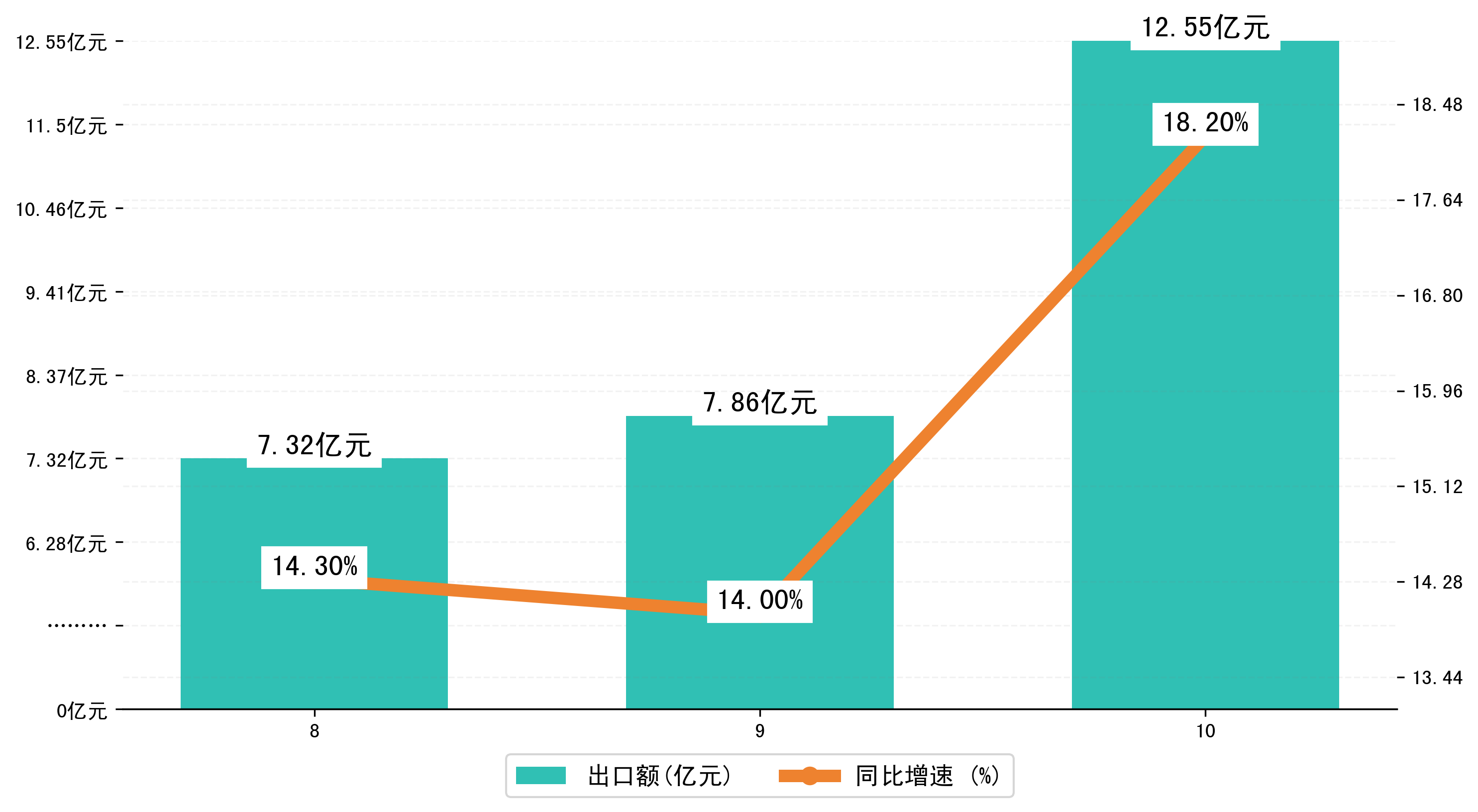 以人民币计,2023年10月北海市出口额为12,5492.6837万元,相比上月增加了4,6925.4702万元;相比上年同期增加了5,1595.0713万元,同比增加了18.20%。