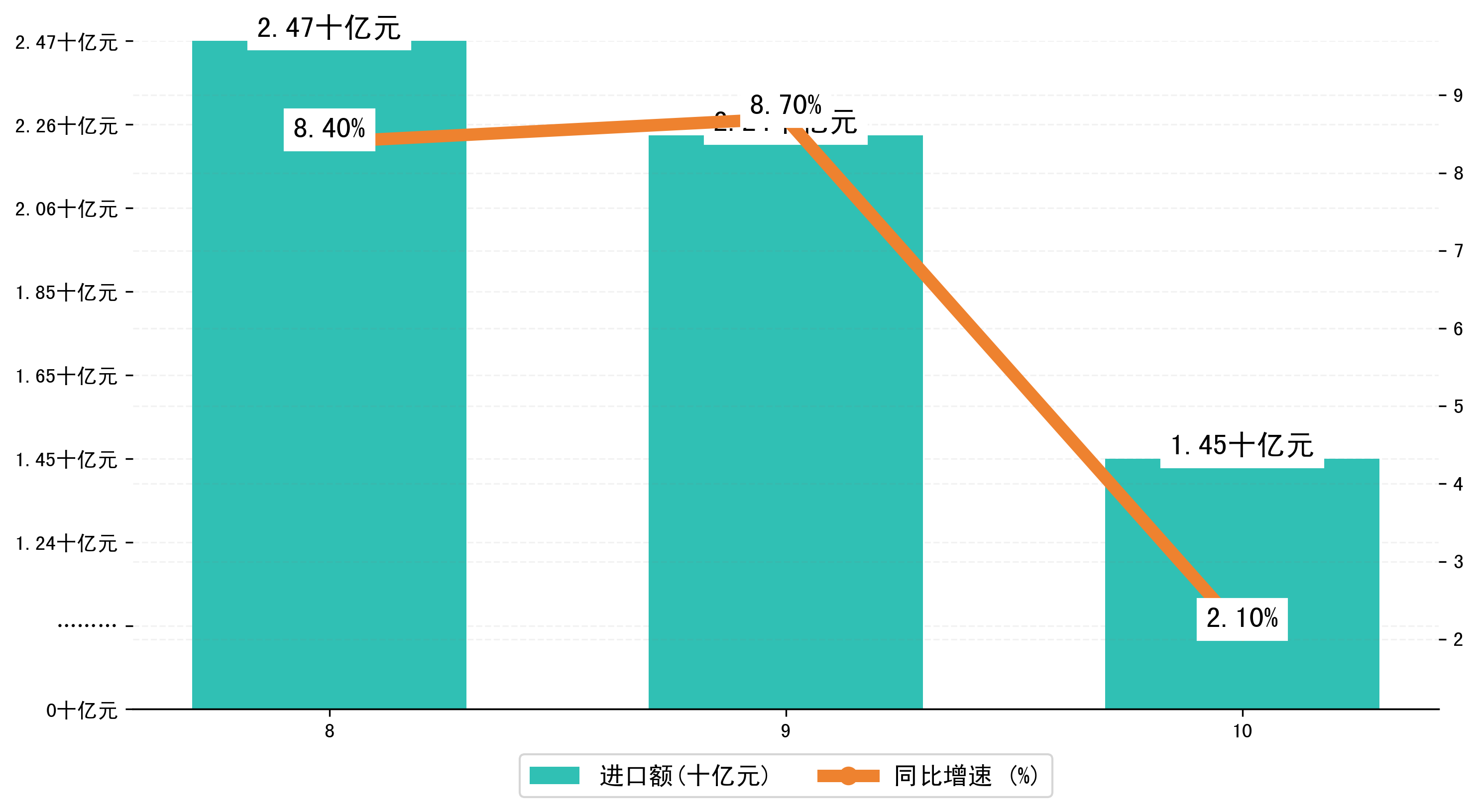 以人民币计,2023年10月北海市进口额为14,4714.975万元,相比上月减少了7,8893.4937万元;相比上年同期减少了10,3242.9416万元,同比增加了2.10%。