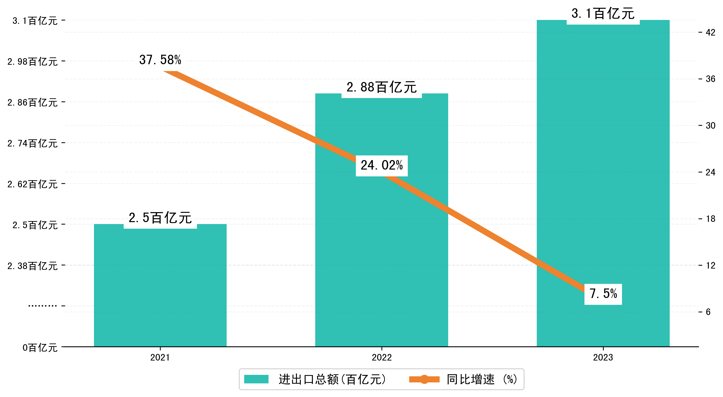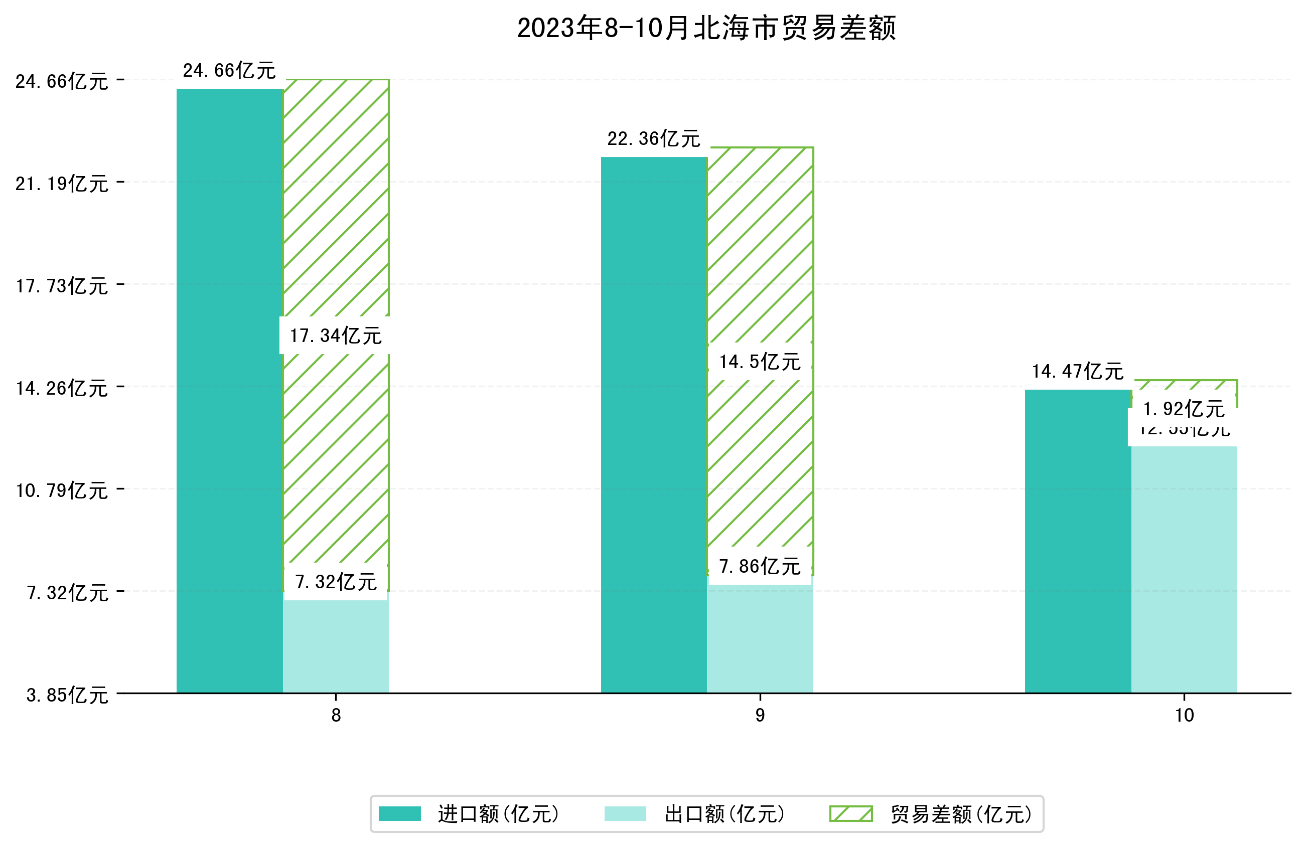 以人民币计,2023年1-10月北海市进出口总额为309,7994.3956万元,相比上年同期增加了21,6230.9575万元,同比增加了7.60%。