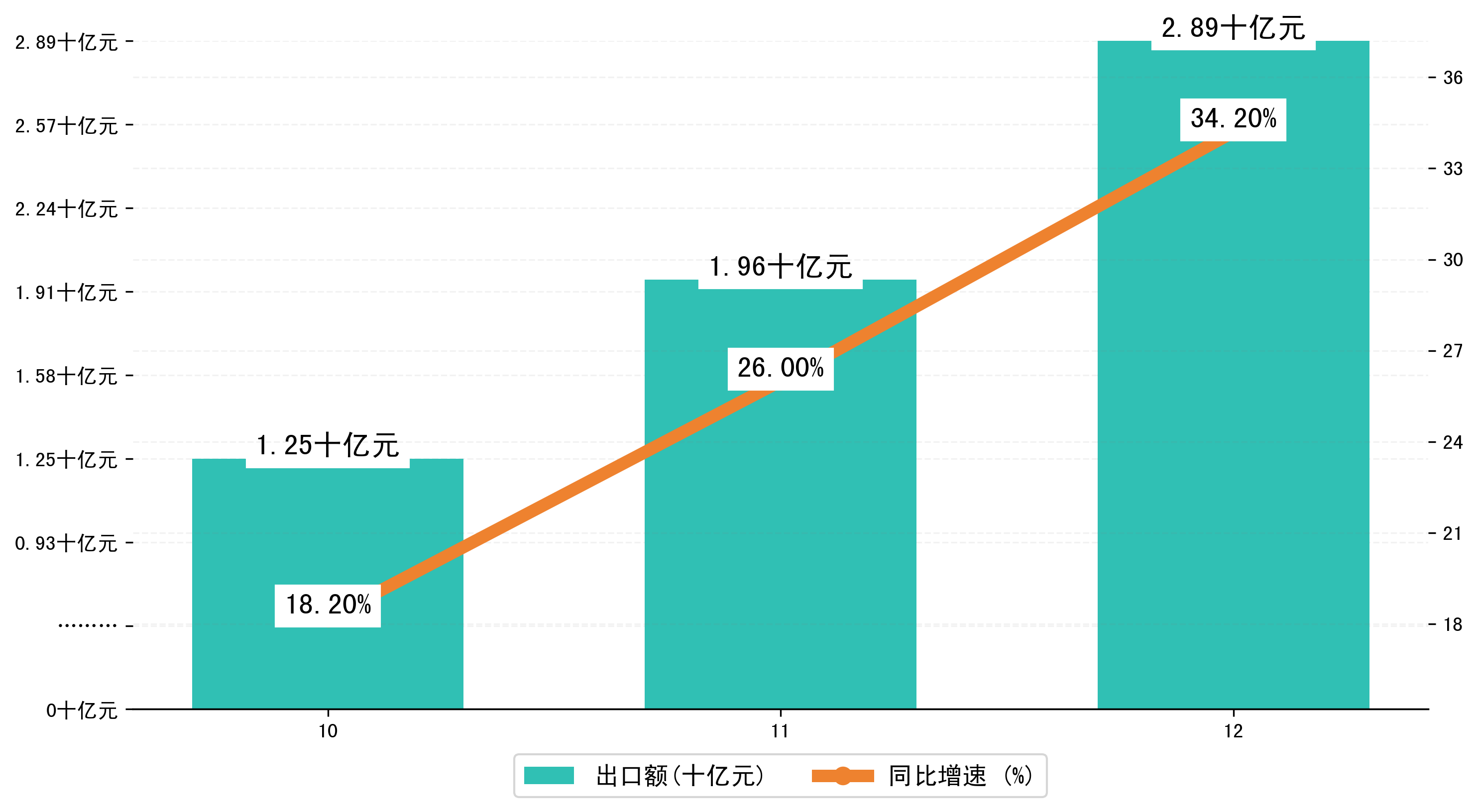 以人民币计,2023年1-12月北海市出口额为158,3270.4549万元,相比上年同期增加了40,3489.2947万元,同比增加了34.20%。