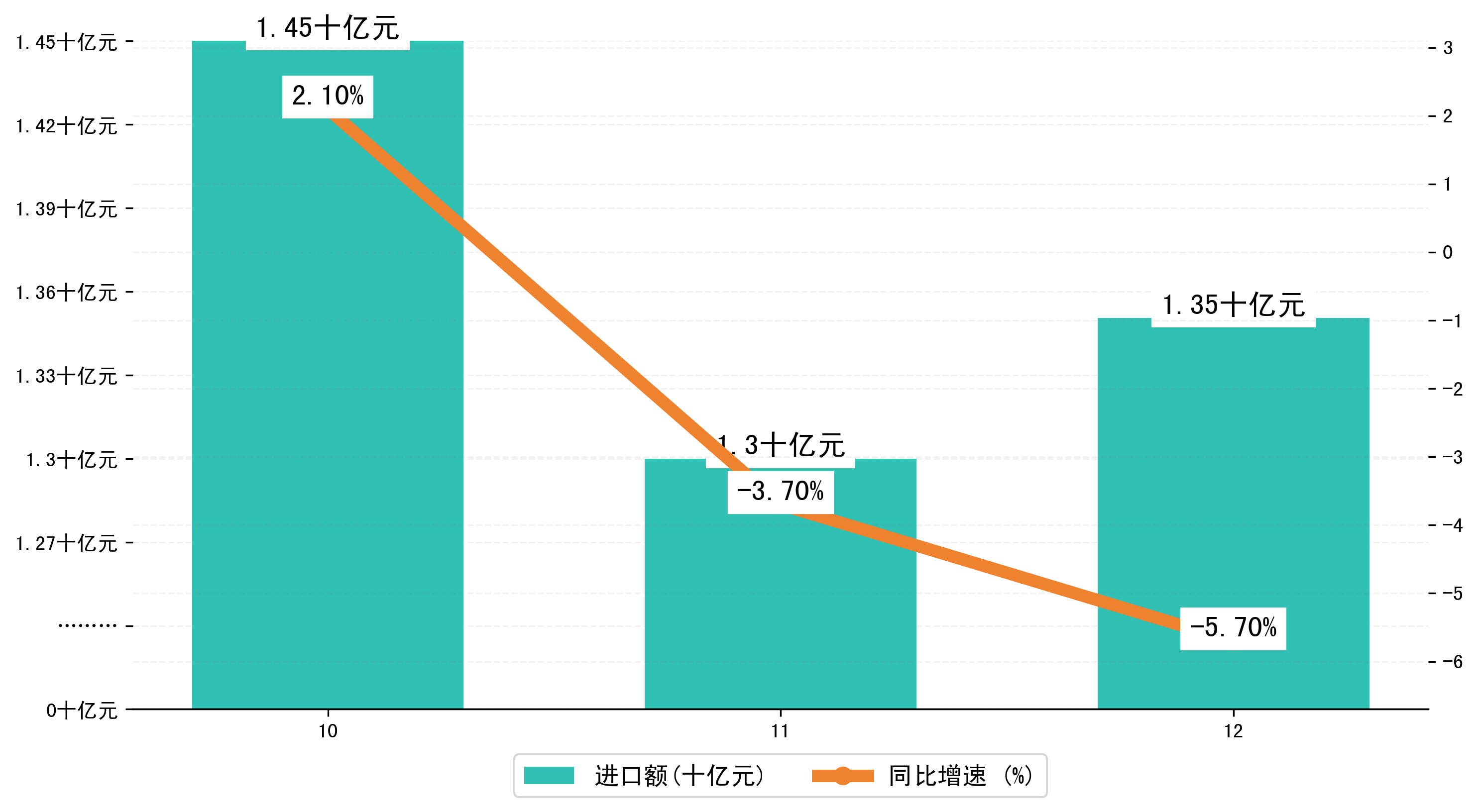 以人民币计,2023年12月北海市进口额为13,5058.5022万元,相比上月增加了4898.4043万元;相比上年同期增加了1,3597.5649万元,同比减少了-5.70%。