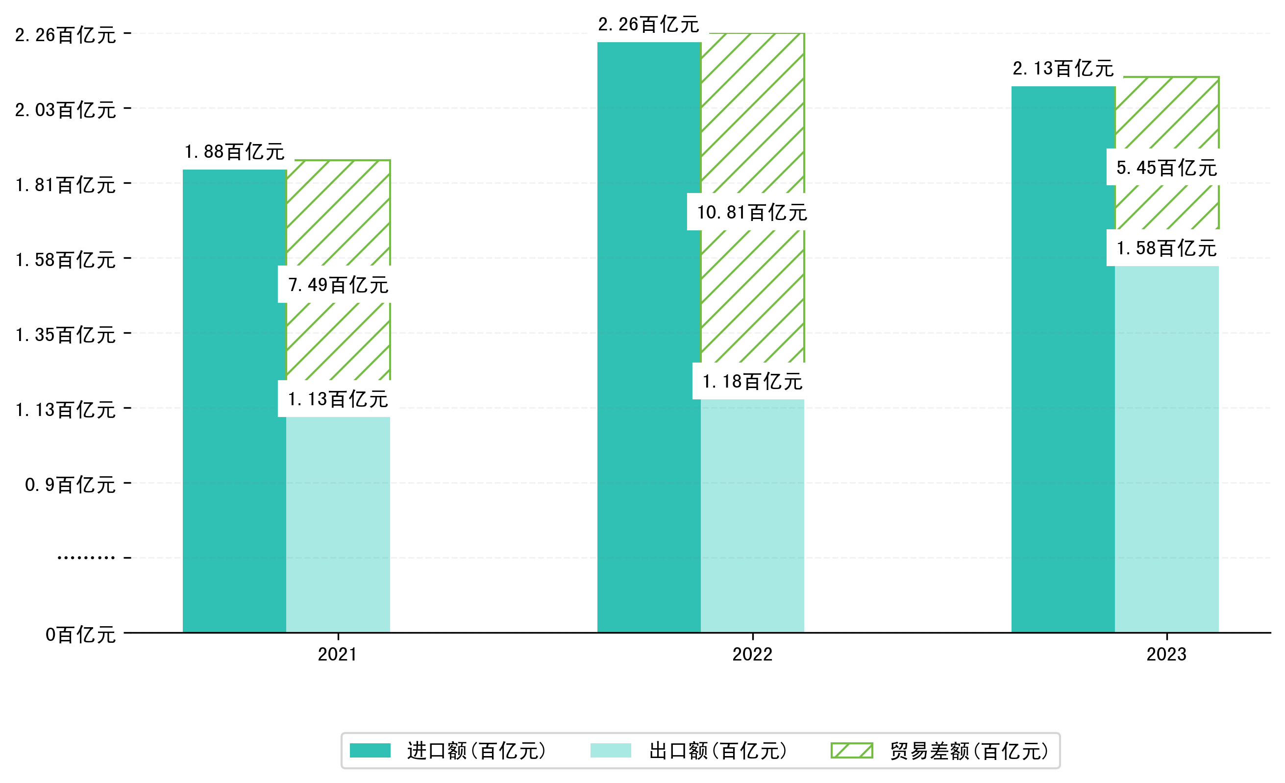 以人民币计,2023年1-12月北海市进口额为212,8155.7203万元,相比上年同期减少了13,2794.3492万元,同比减少了-5.70%。