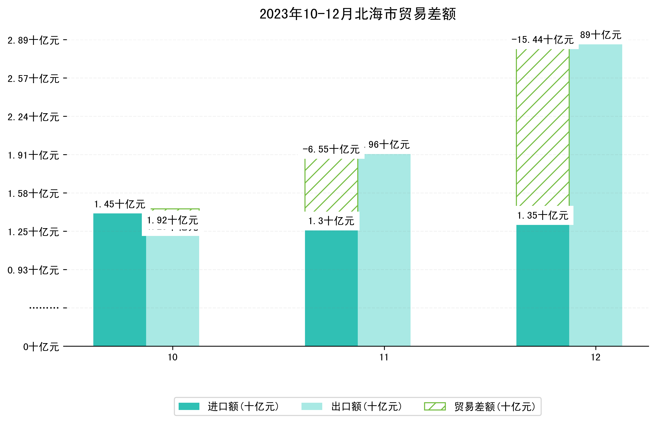 以人民币计,2023年1-12月北海市贸易差额为54,4885,2654万元(贸易逆差),相比上年同期增加了53,6283,6439万元,同比增加-49.6%。