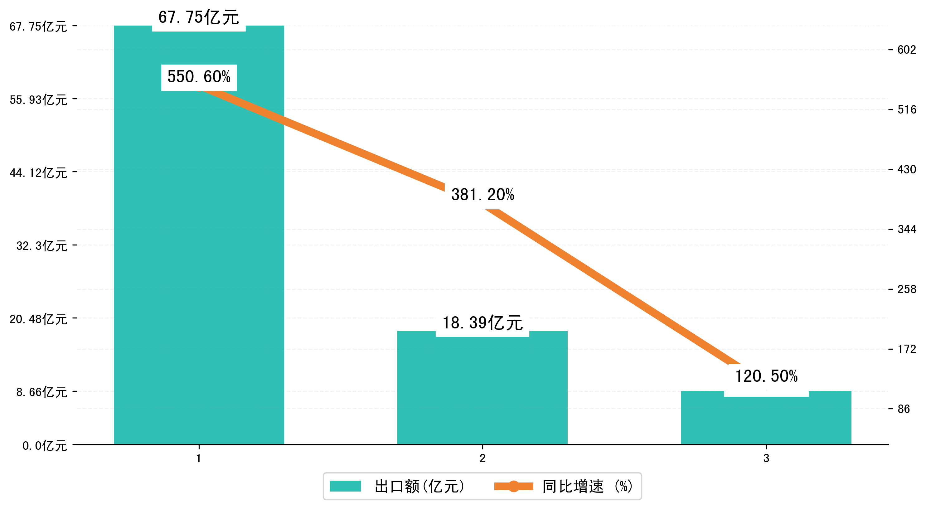 以美元计,2025年1-3月北海市出口额为13,1889.8438万美元,相比上年同期增加了7,1390.3047万美元,同比增加118.10%。