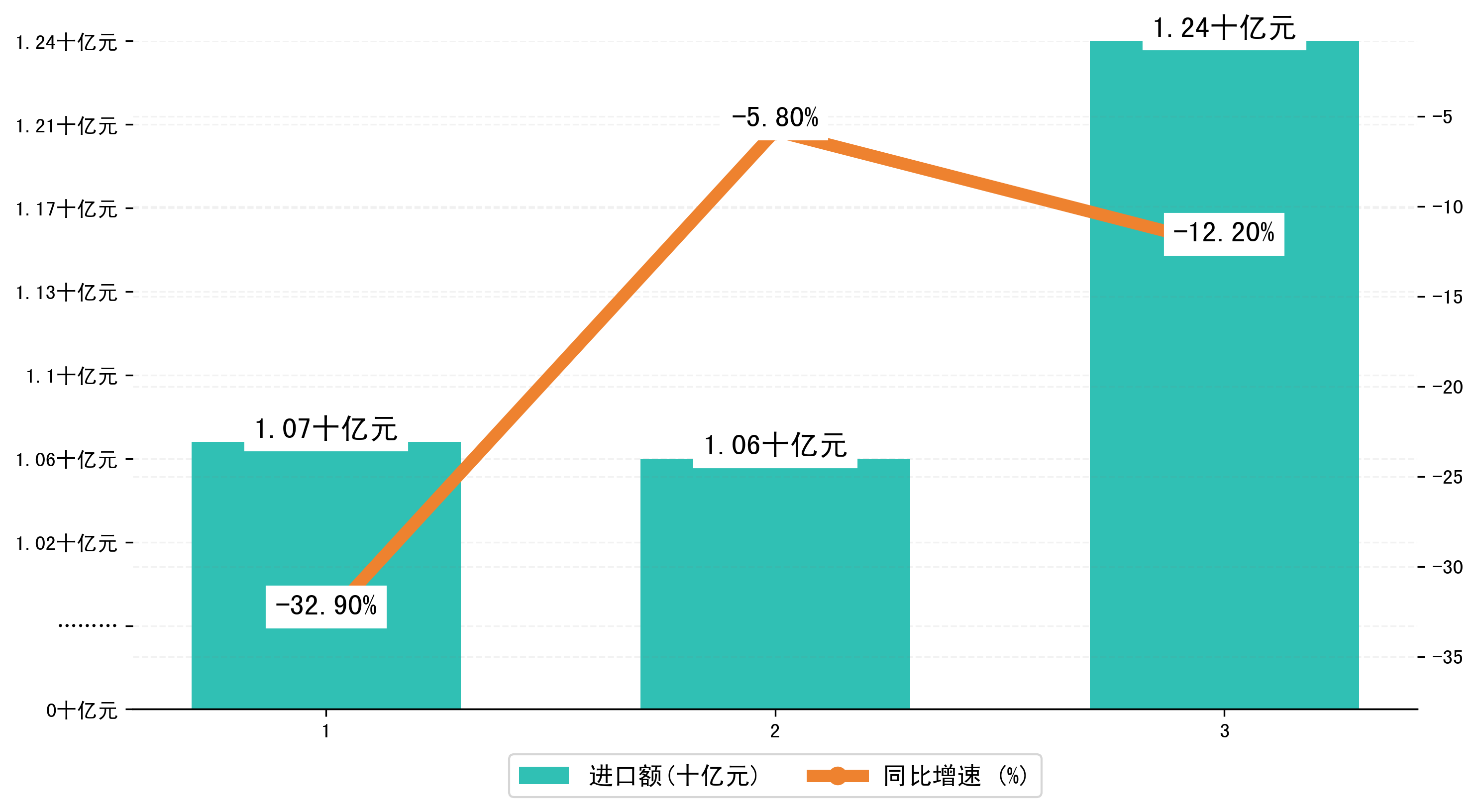 以人民币计,2025年1-3月北海市进口额为33,6925.4918万元,相比上年同期减少了4,5219.1013万元,同比减少了-12.20%。