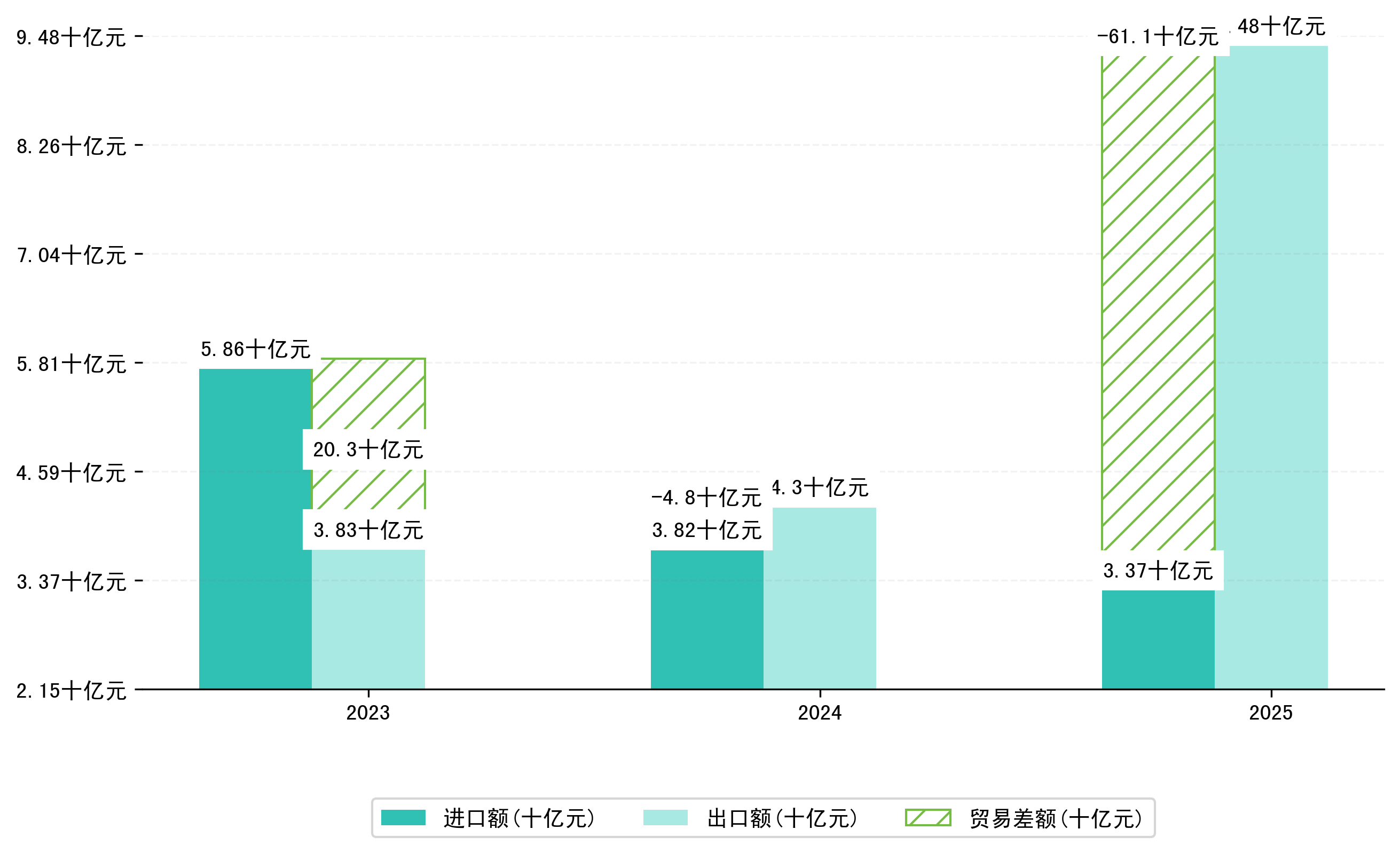 以美元计,2025年1-3月北海市贸易差额为8,4984,7428万美元(贸易顺差),相比上年同期增加了7,8173,1578万美元,同比增加1147.65%。