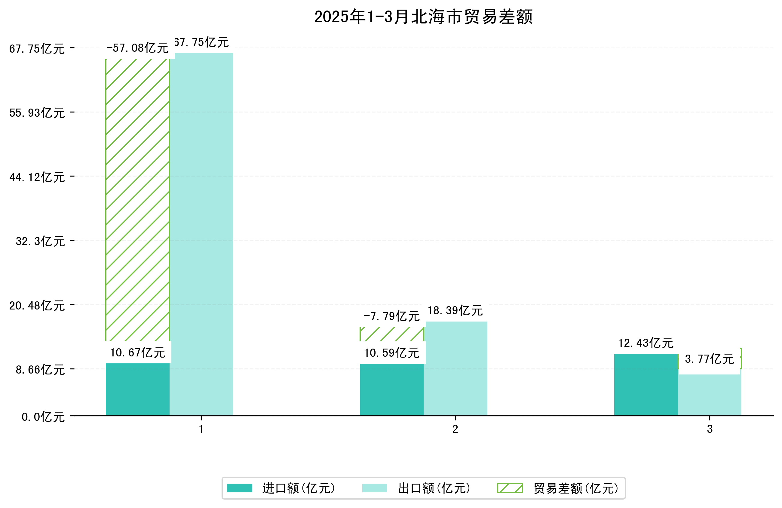 以人民币计,2025年1-3月北海市贸易差额为61,1040,5667万元(贸易顺差),相比上年同期增加了56,3042,3693万元,同比增加1173.05%。