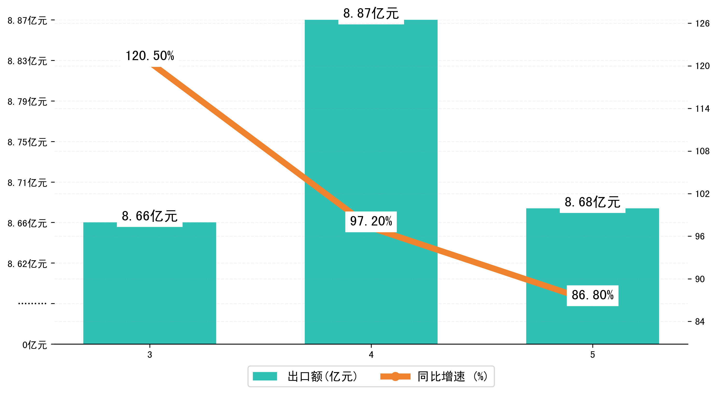 以人民币计,2025年5月北海市出口额为8,6789.478万元,相比上月减少了1950.6362万元;相比上年同期增加了1,1148.0148万元,同比增加了86.80%。