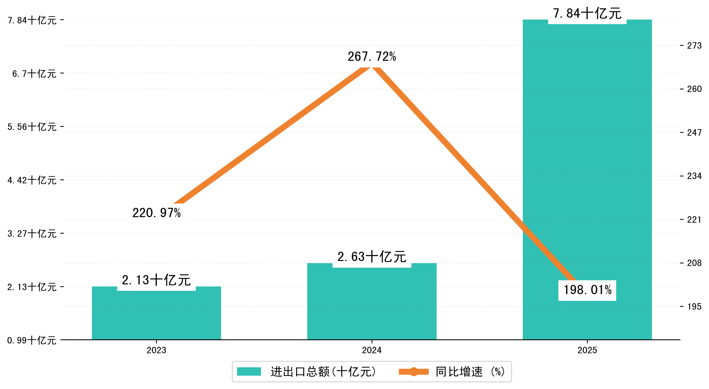 以人民币计,2025年1月北海市进出口总额为78,4148.8303万元,相比上月增加了12,0279.2797万元;相比上年同期增加了52,1016.8886万元,同比增加了198.00%。