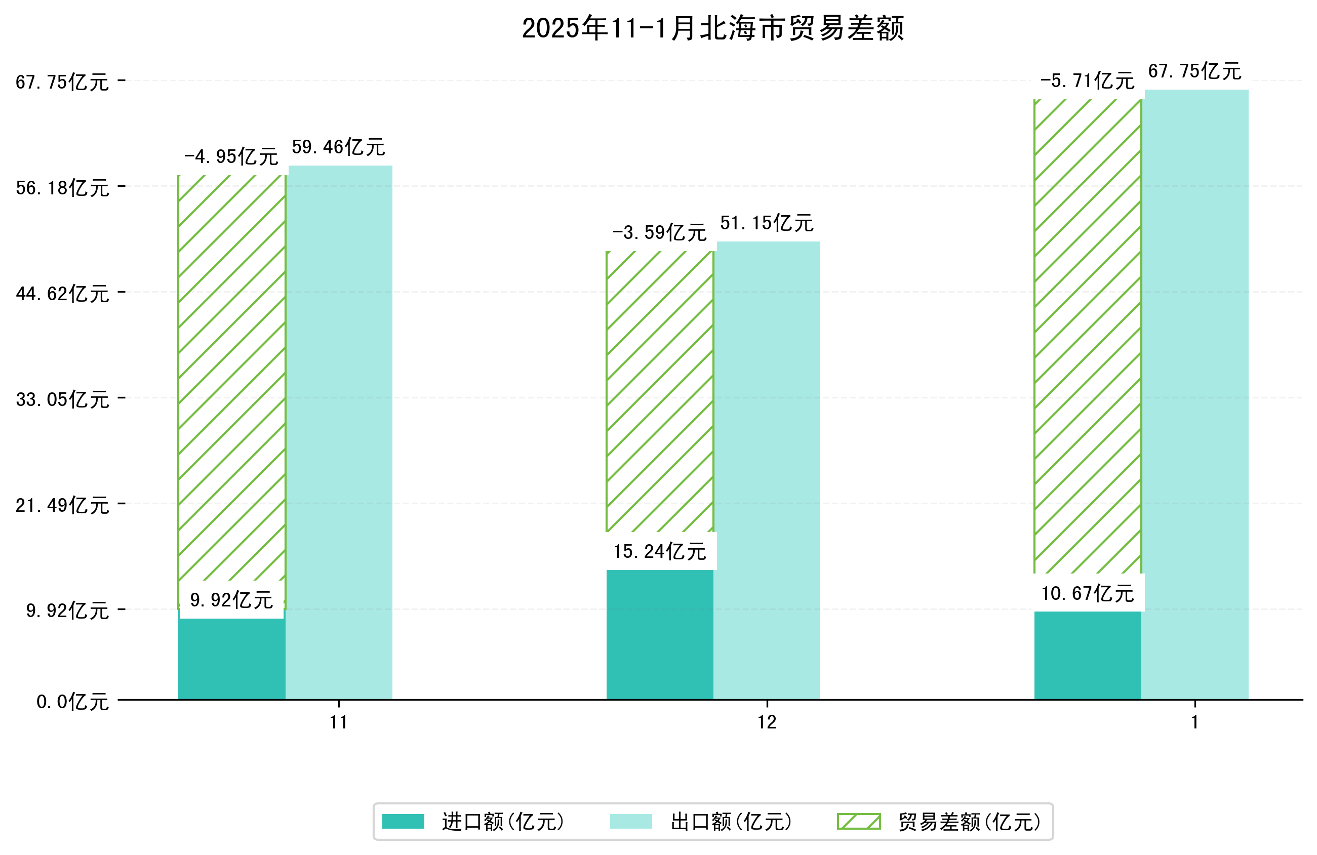 以美元计,2025年1-1月北海市贸易差额为7,9399,4452万美元(贸易顺差),相比上年同期增加了8,7067,4941万美元,同比增加-1135.46%。