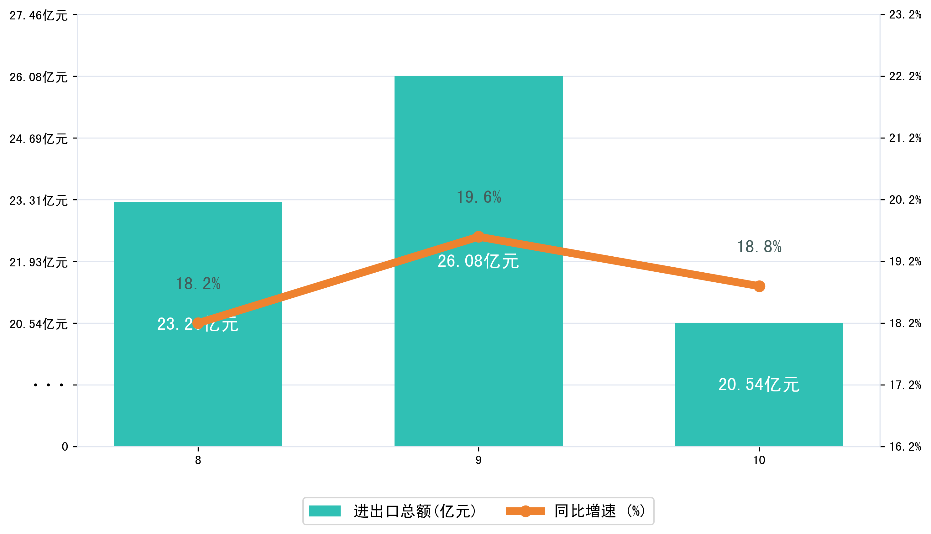 以人民币计,2025年10月北海市进出口总额为20,5424.5391万元,相比上月减少了5,5365.3244万元;相比上年同期增加了1,7969.1612万元,同比增加了18.80%。