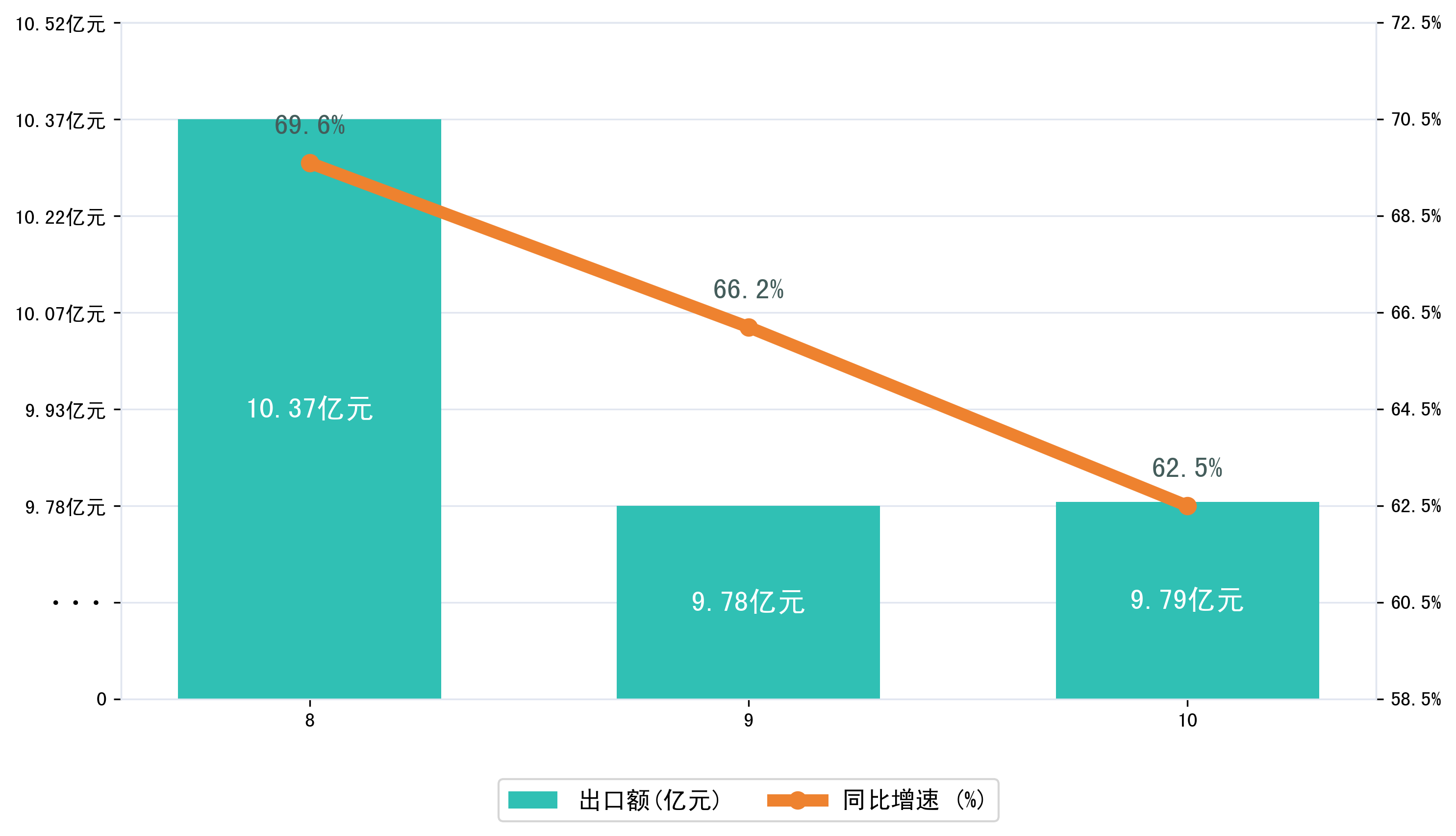 以人民币计,2025年10月北海市出口额为9,7875.5077万元,相比上月增加了61.7723万元;相比上年同期增加了1,6717.2499万元,同比增加了62.50%。
