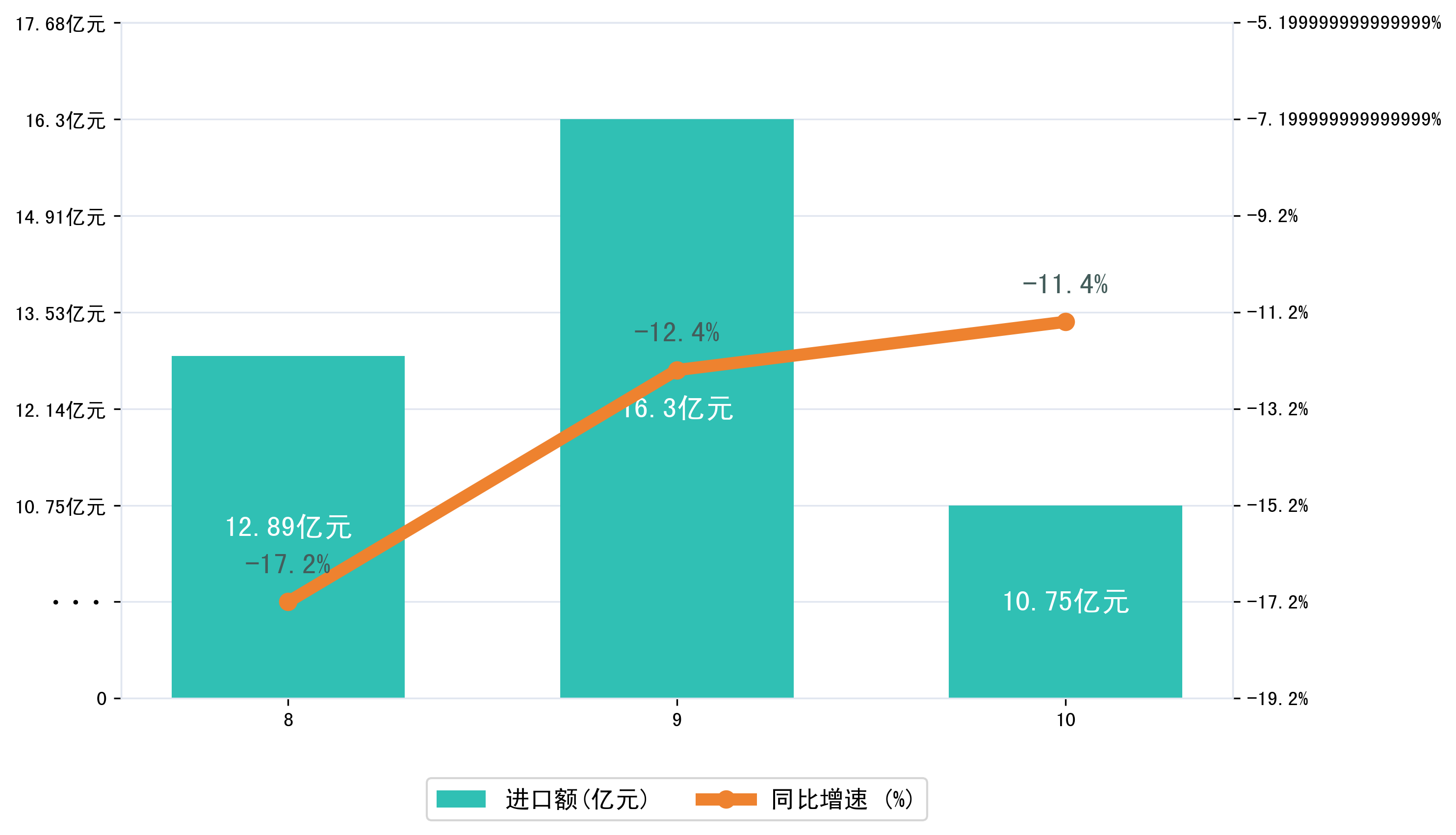 以美元计,2025年10月北海市进口额为1,5121.4948万美元,相比上月减少了7720.7736万美元;相比上年同期增加了138.8488万美元,同比减少-12.10%。