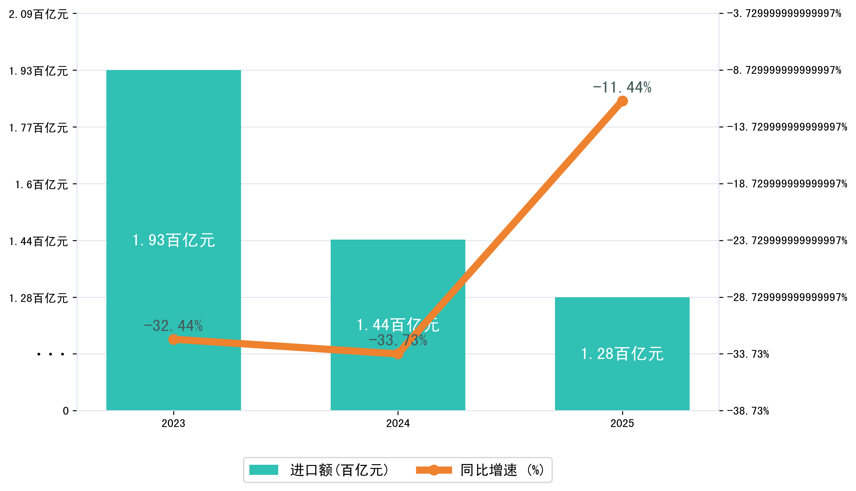 以人民币计,2025年1-10月北海市进口额为127,8604.793万元,相比上年同期减少了16,5121.9955万元,同比减少了-11.40%。