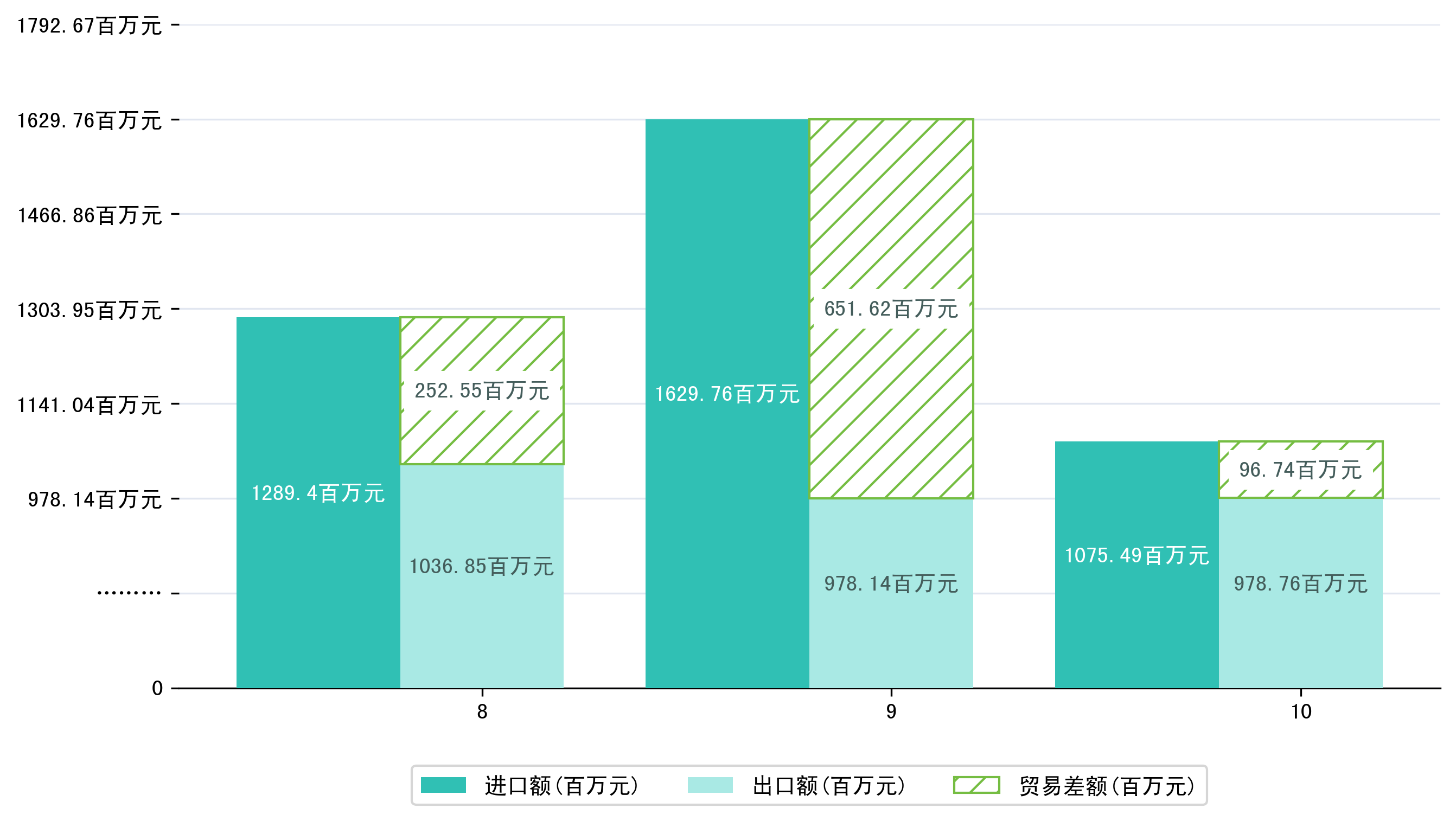 以人民币计,2025年10月北海市贸易差额为9673,5237万元(贸易逆差),相比上月增加了5,5488,8690万元,即7781,3116万美元;相比上年同期增加了1,5465,3386万元,同比增加-61.52%。
