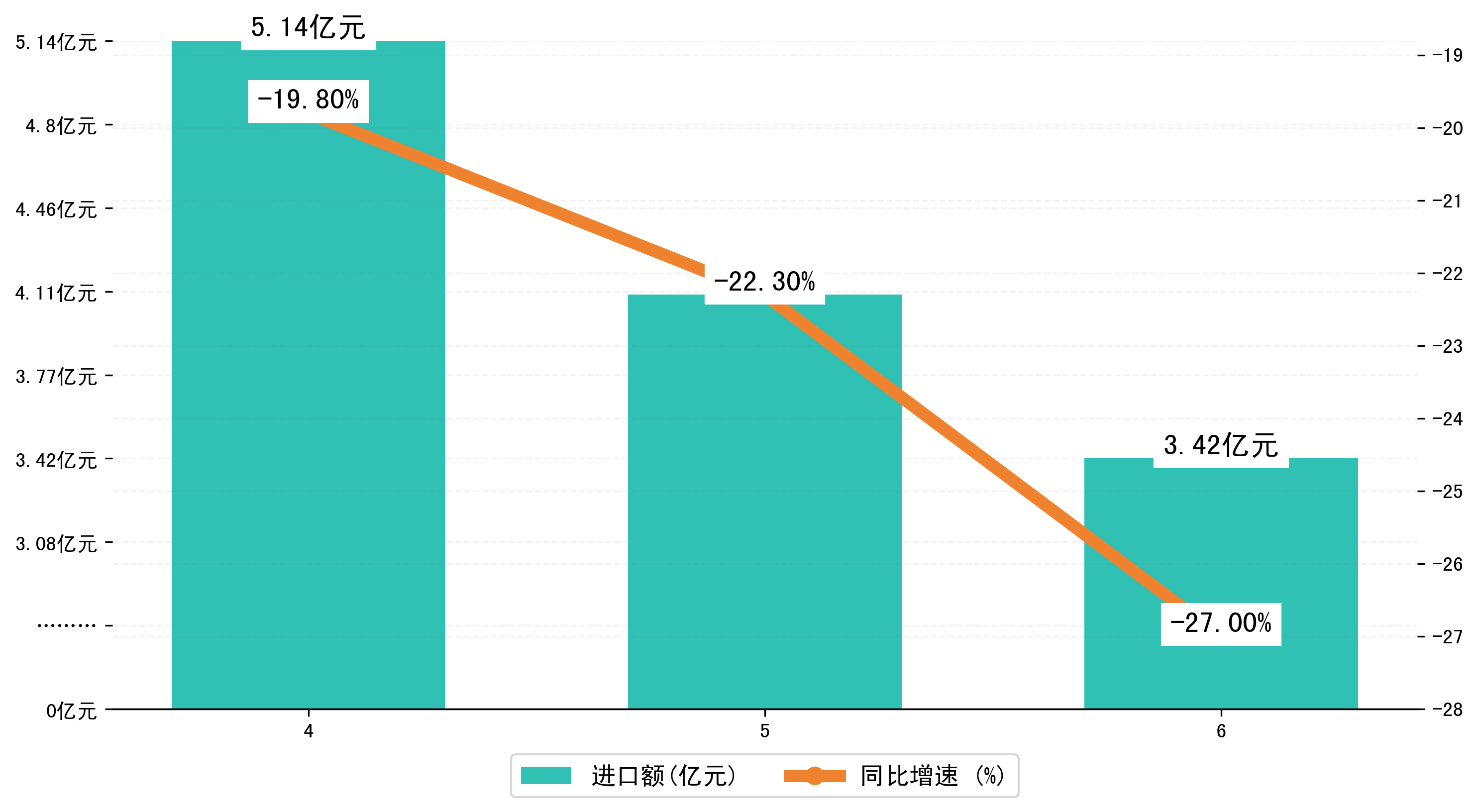 以人民币计,2024年6月蚌埠市进口额为3,4240.0699万元,相比上月减少了6738.0969万元;相比上年同期减少了3,1425.8498万元,同比减少了-27.00%。