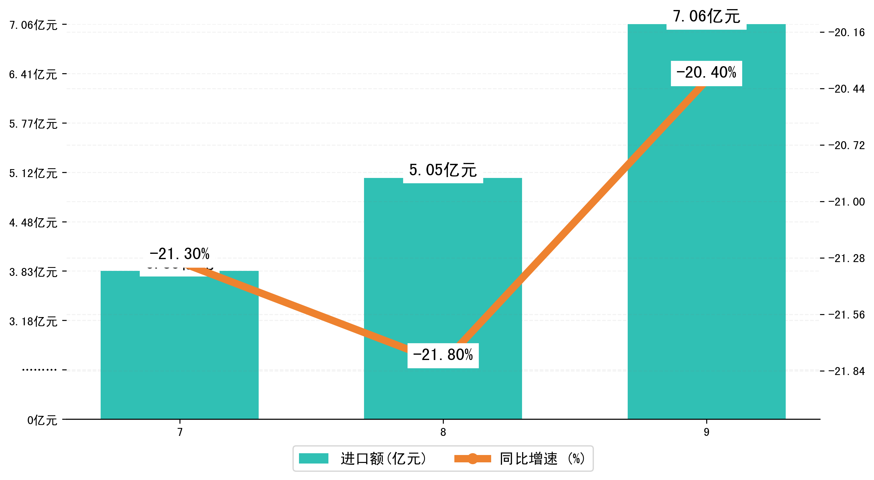 以人民币计,2023年9月蚌埠市进口额为7,0581.8379万元,相比上月增加了2,0096.8398万元;相比上年同期减少了8464.6594万元,同比减少了-20.40%。