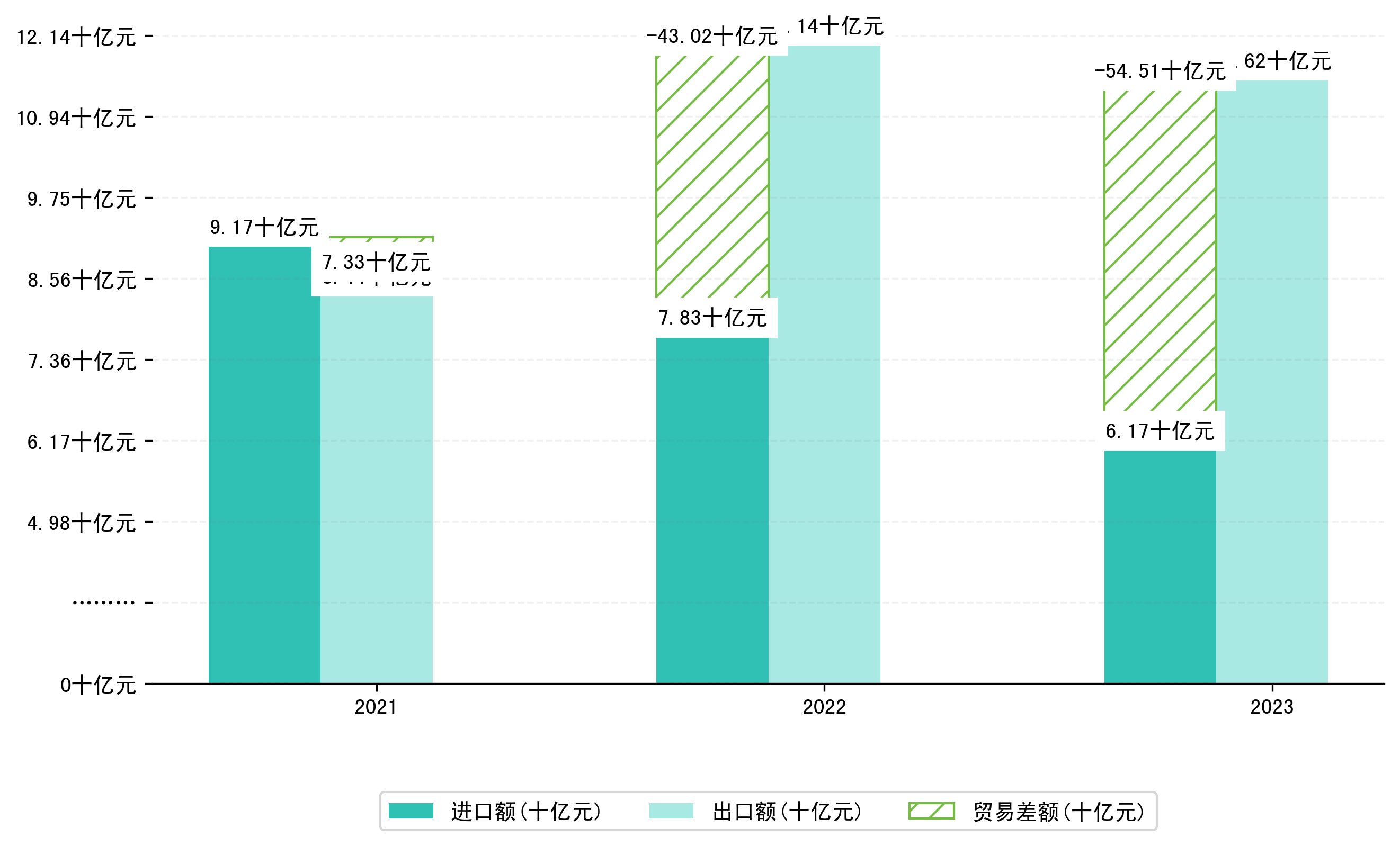 以人民币计,2023年1-12月蚌埠市贸易差额为54,5136,1732万元(贸易顺差),相比上年同期增加了11,4901,1038万元,同比增加26.71%。