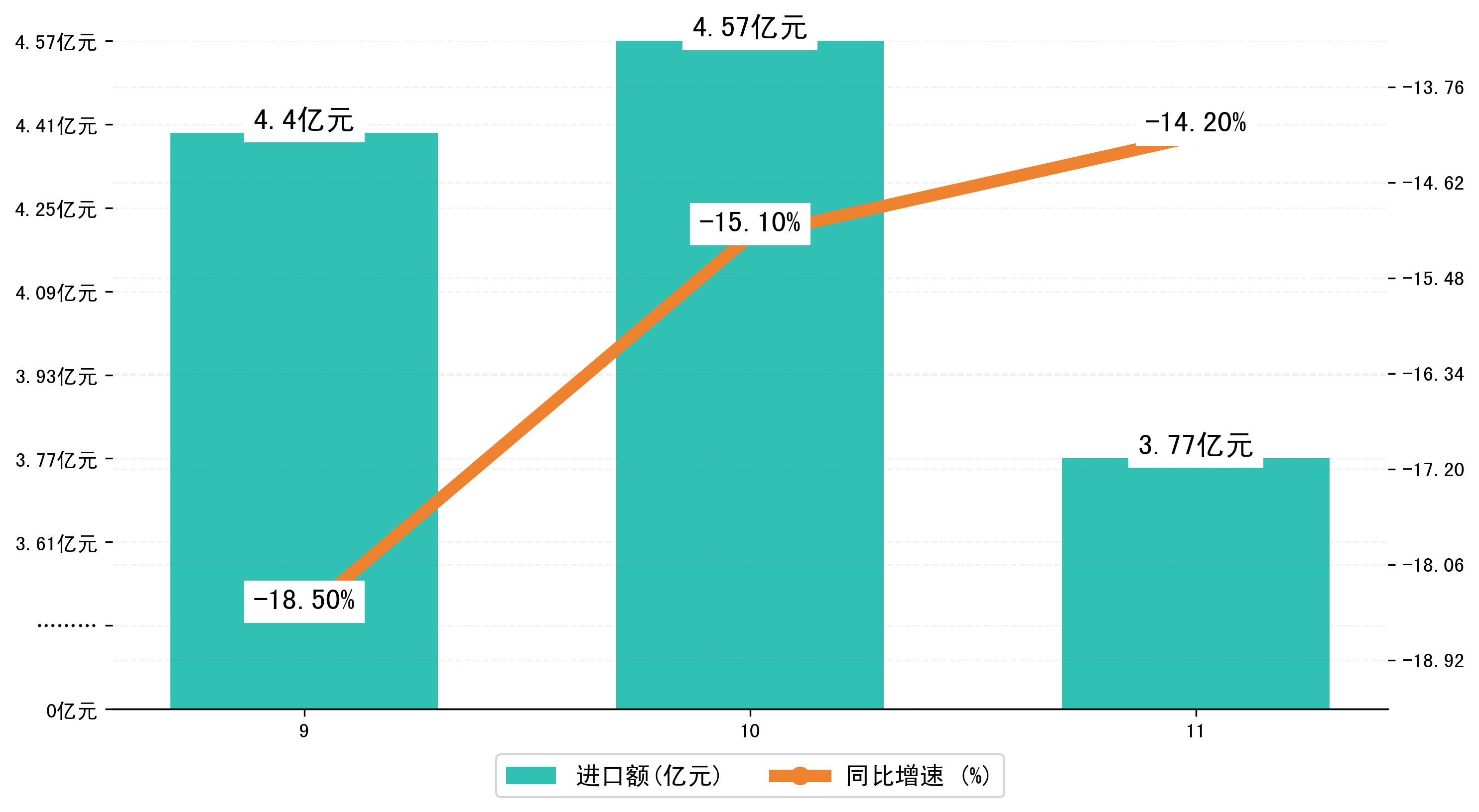 以人民币计,2024年11月蚌埠市进口额为3,7694.7058万元,相比上月减少了8042.9322万元;相比上年同期减少了656.0464万元,同比减少了-14.20%。