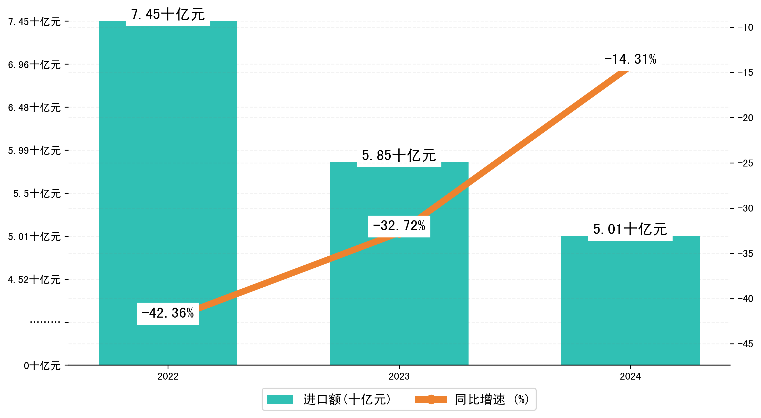以人民币计,2024年1-11月蚌埠市进口额为50,1239.639万元,相比上年同期减少了8,3732.7554万元,同比减少了-14.20%。