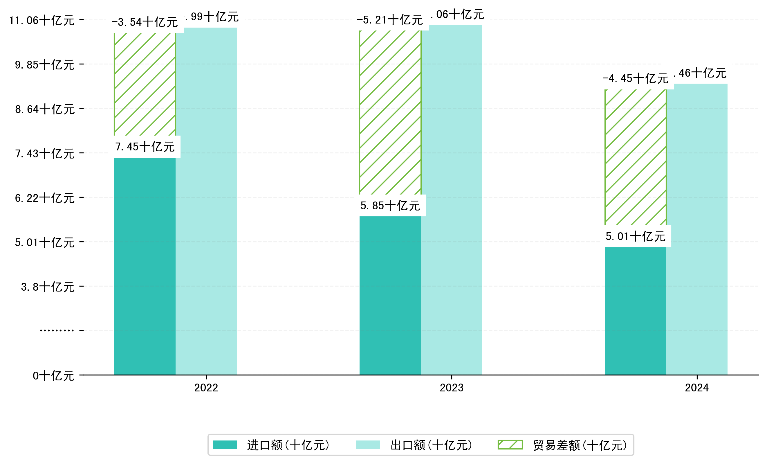 以人民币计,2024年1-11月蚌埠市贸易差额为44,4919,1314万元(贸易顺差),相比上年同期减少了7,6256,2269万元,同比减少-14.63%。