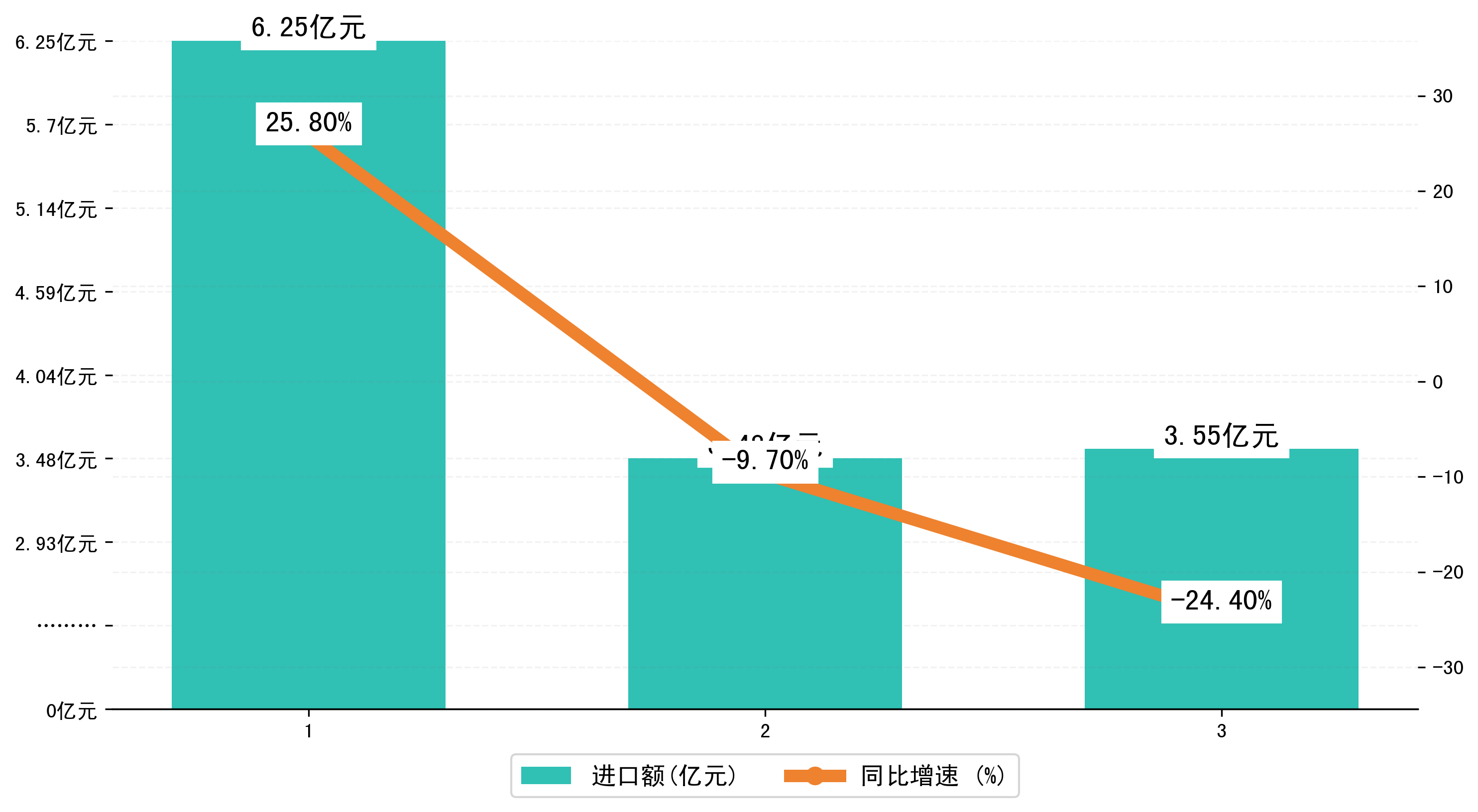 以美元计,2024年1-3月蚌埠市进口额为1,8693.4509万美元,相比上年同期减少了6973.4353万美元,同比减少-27.10%。