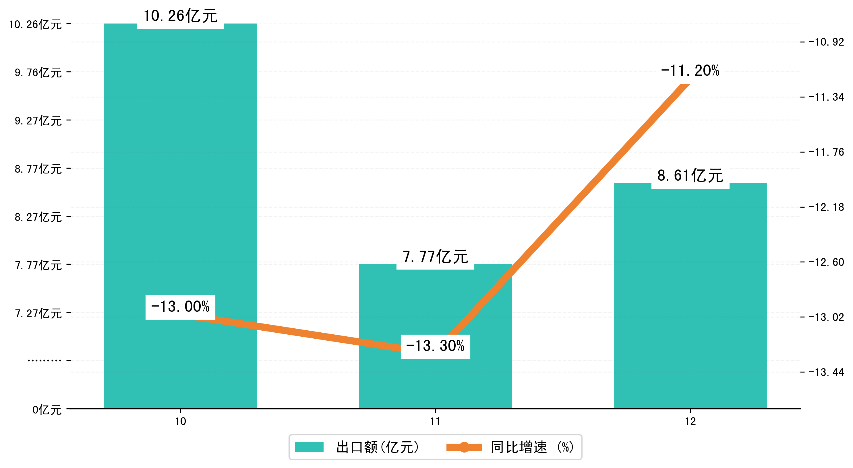 以美元计,2024年12月蚌埠市出口额为1,2005.0618万美元,相比上月增加了1083.8381万美元;相比上年同期增加了2175.3898万美元,同比减少-12.70%。