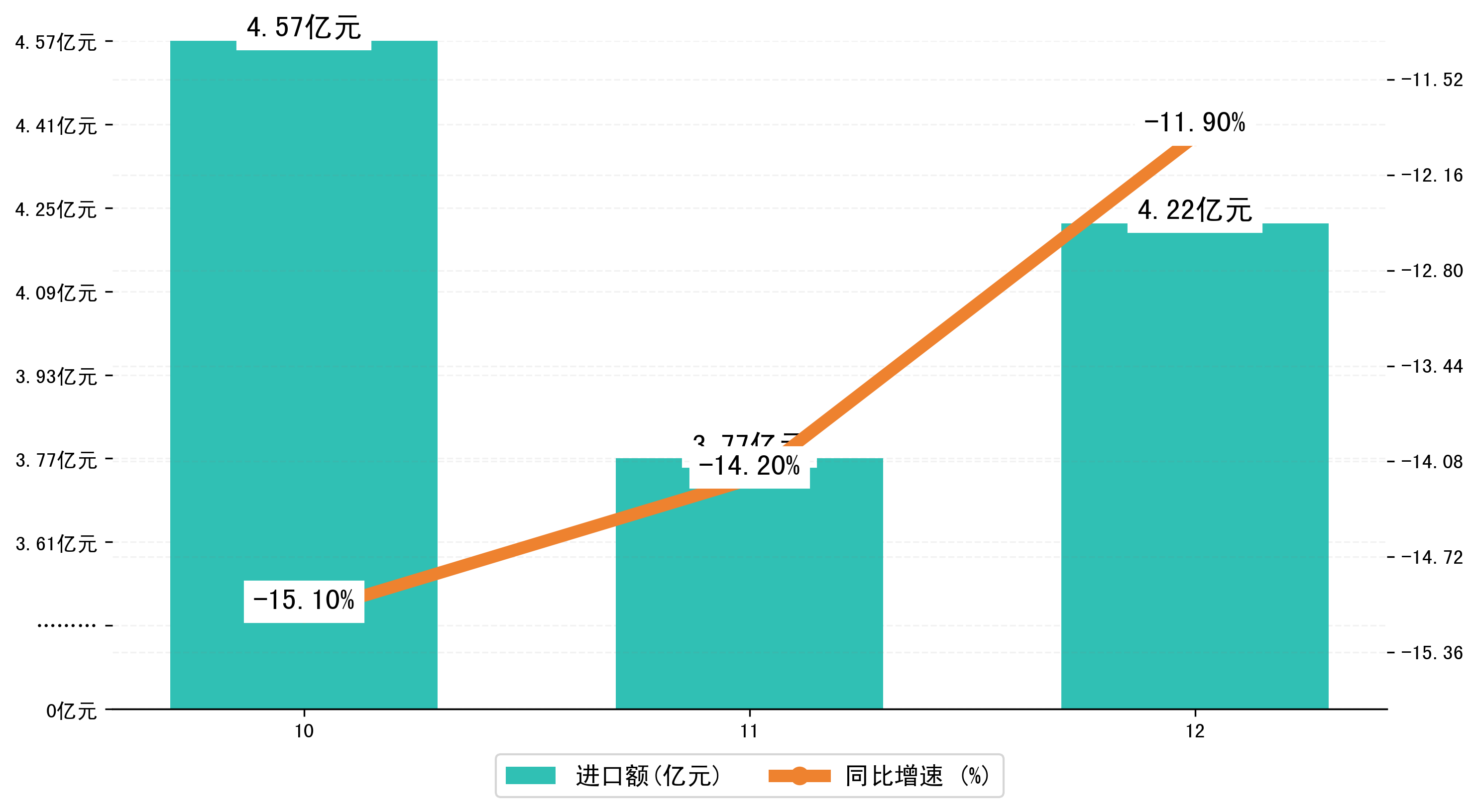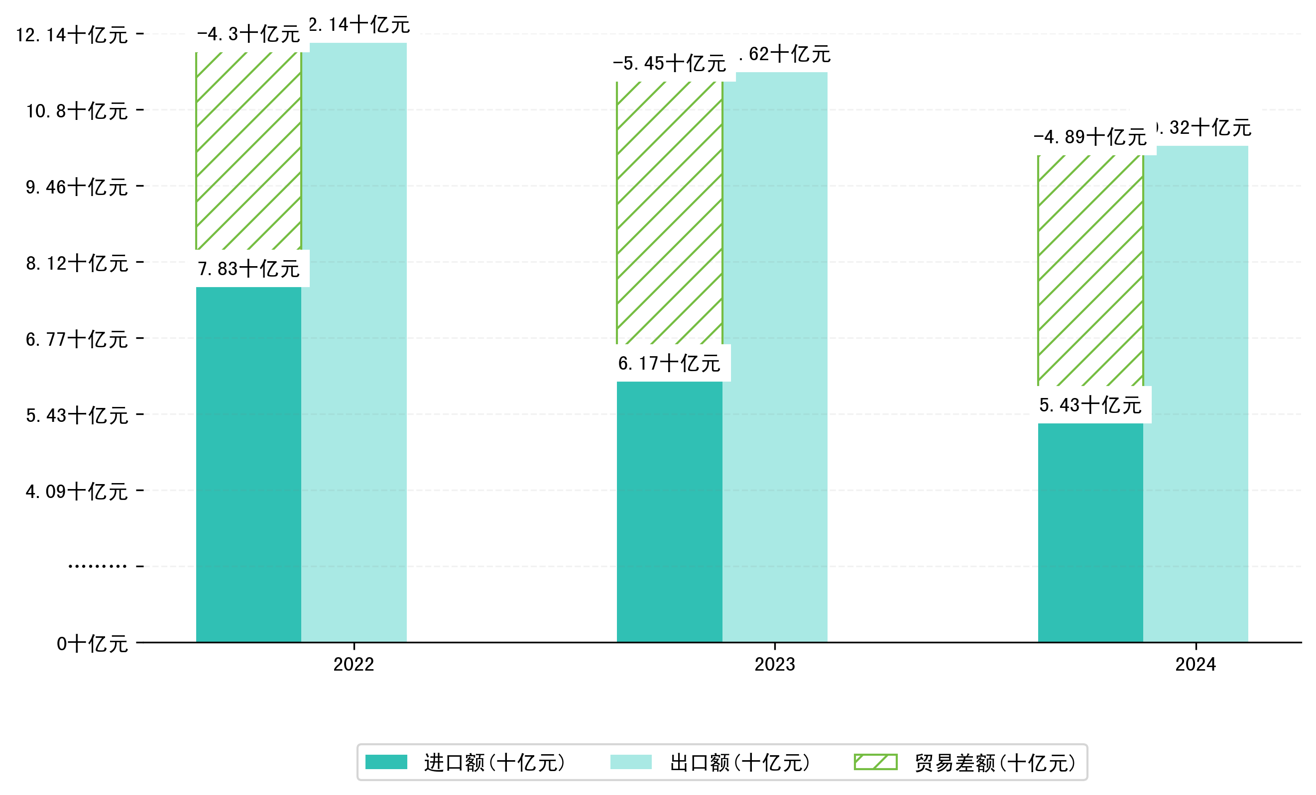 以人民币计,2024年1-12月蚌埠市进口额为54,3461.1274万元,相比上年同期减少了7,3463.0658万元,同比减少了-11.90%。