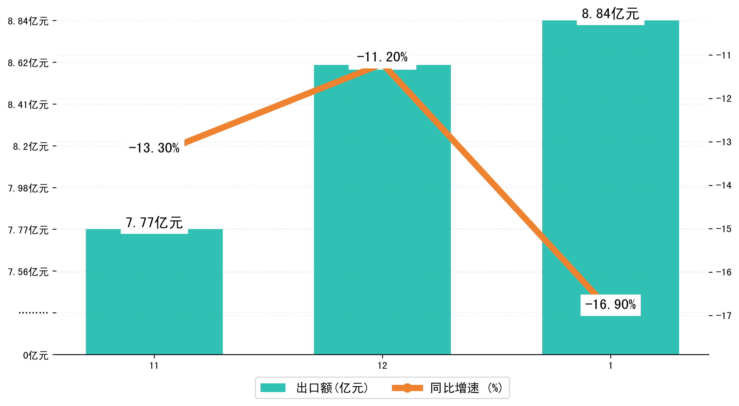 以美元计,2025年1-1月蚌埠市出口额为1,2284.0646万美元,相比上年同期减少了2631.3373万美元,同比减少-17.60%。